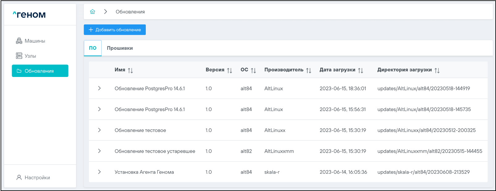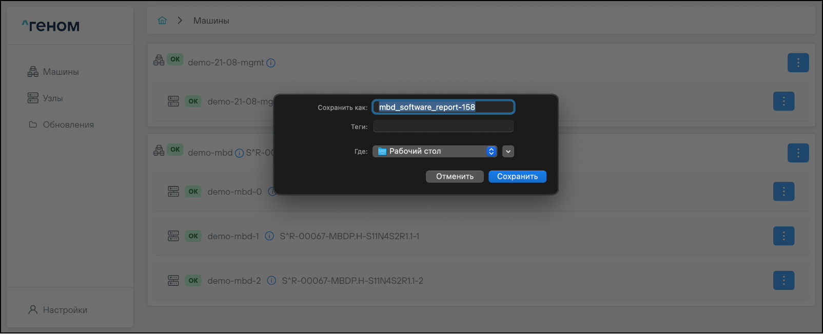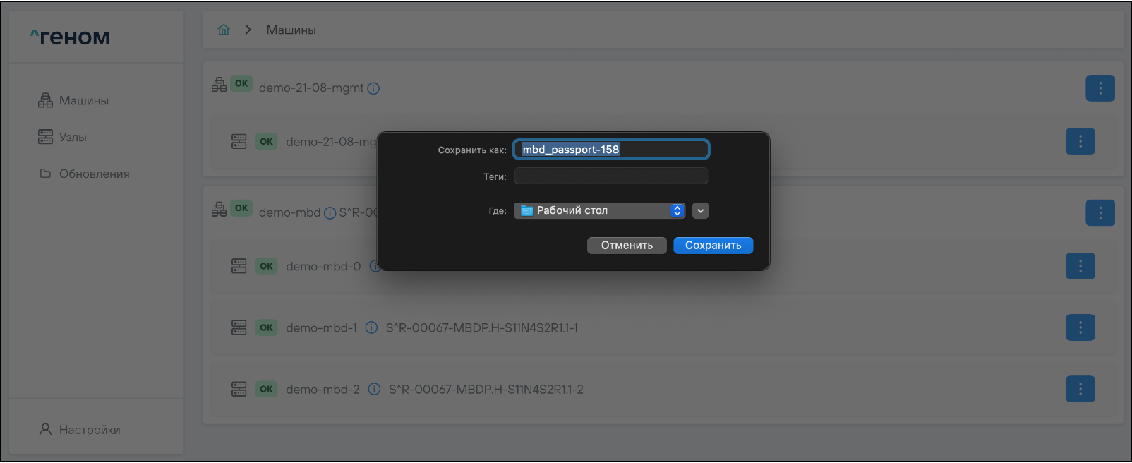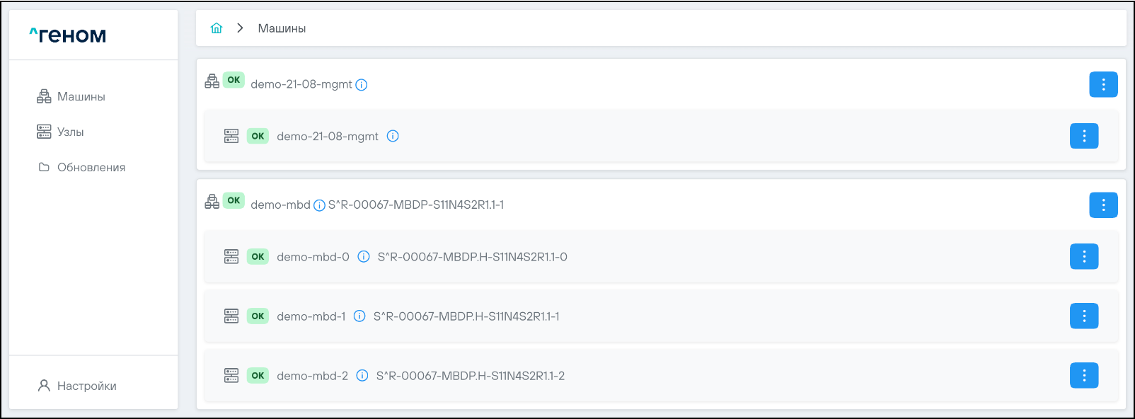 На странице отображается список Машин, которыми управляет экземпляр модуля управления ПО "Скала^р Геном". Для каждой Машины показан список входящих в неё узлов:
