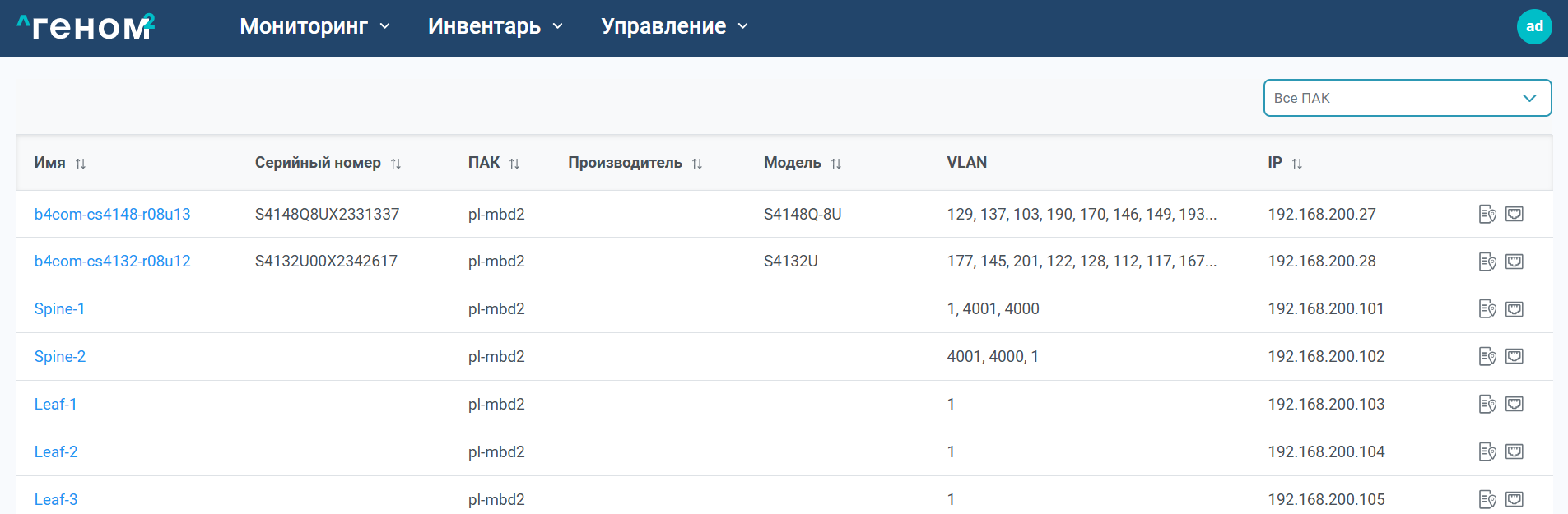Страница со списком коммутаторов имеет вид: