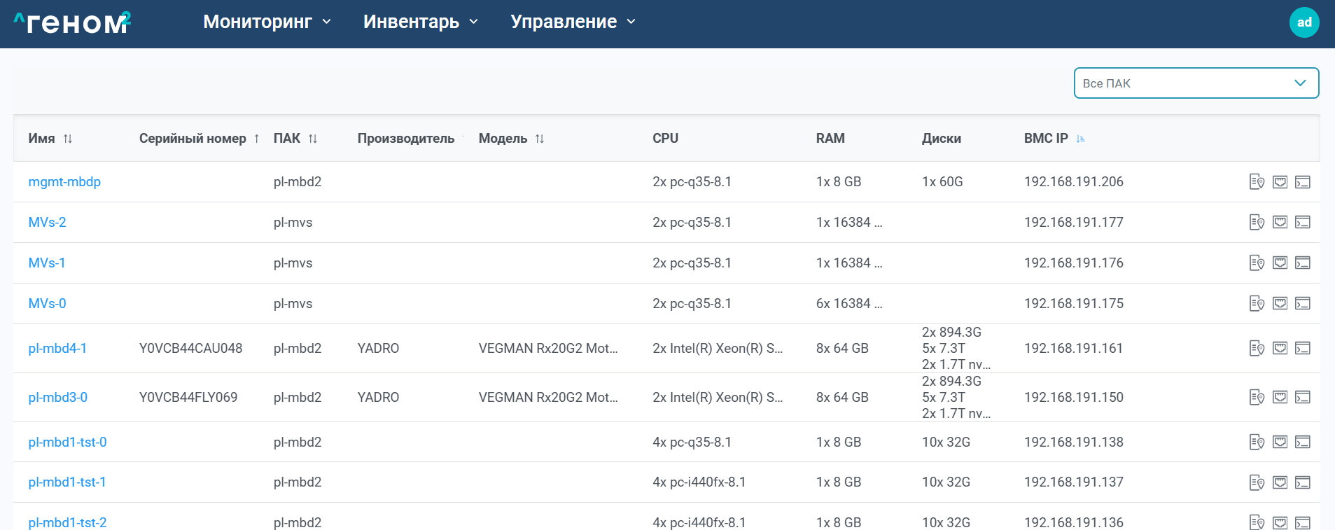 Для фильтрации записей по имени ПАК используйте выпадающее меню справа над таблицей.