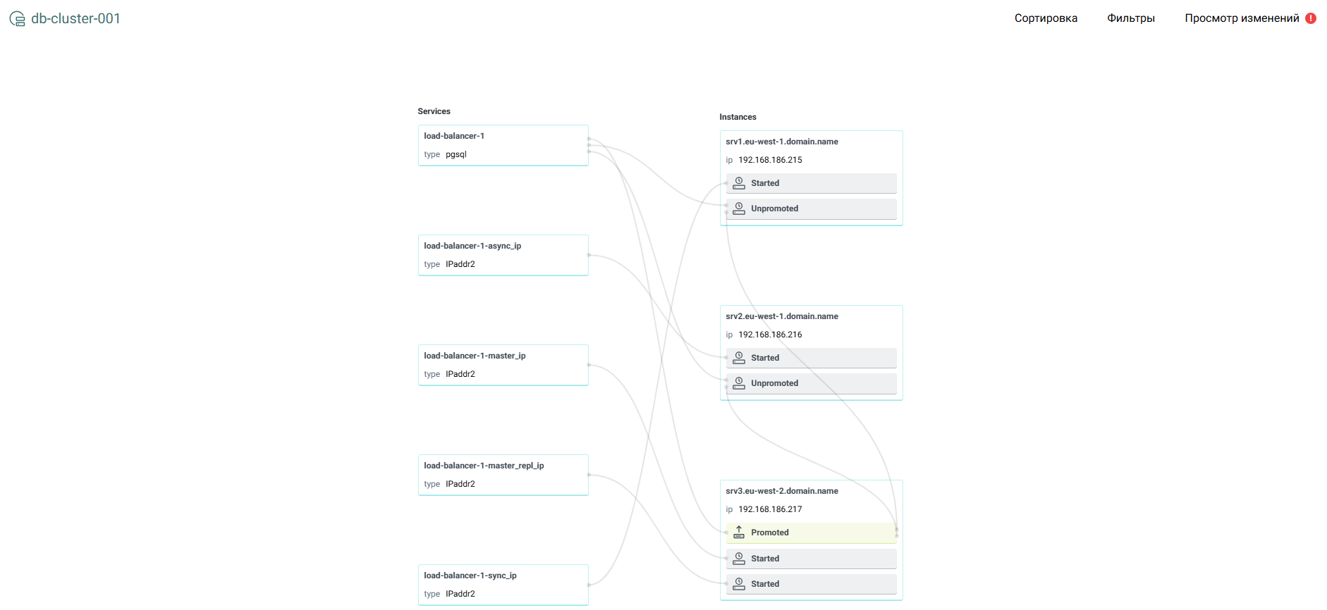 Экран показывает связи сервисов кластера pacemaker/corosync с инстансами БД postgres, развёрнутыми на серверах, а также состояния этих инстансов.