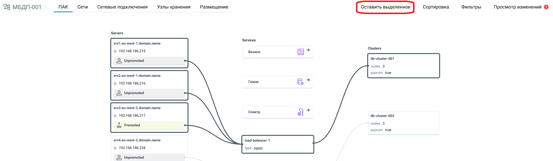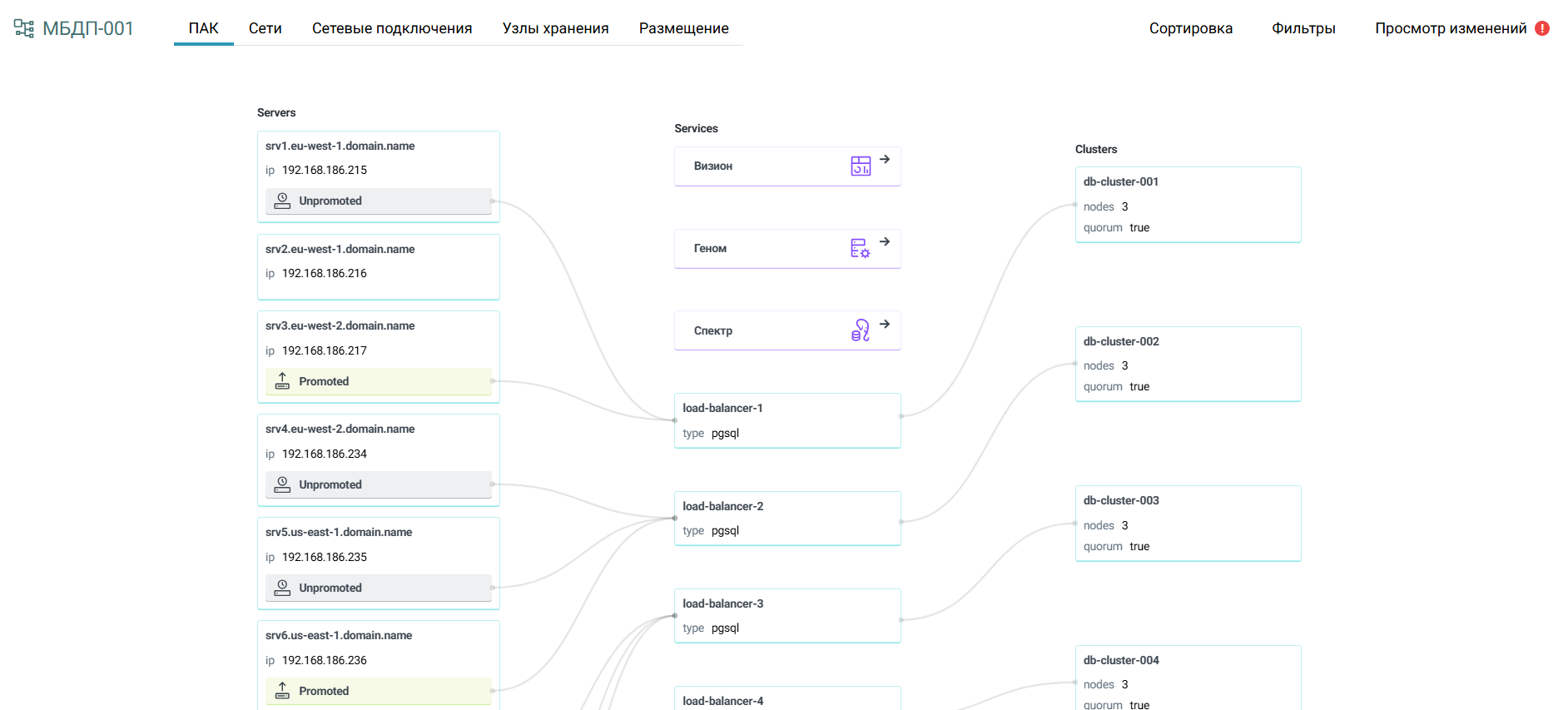 Экран отображает серверы и служебные сервисы ПАК (Визион, Спектр и т. д.). Для ПАК МБД.П также отображаются кластеры pacemaker/corosync и инстансы сервисов БД Postgres.
