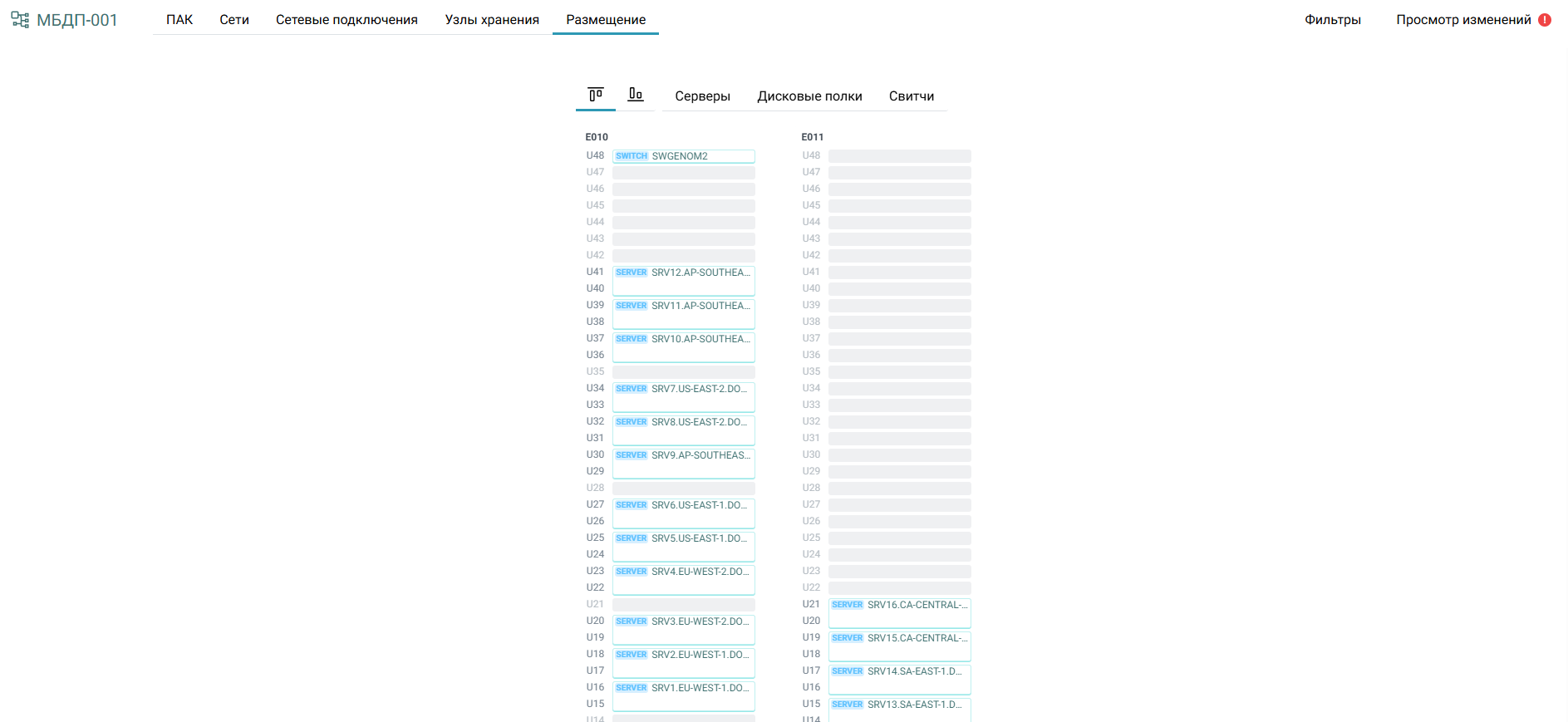 Экран отображает физическое размещение оборудования в стойках. Для каждой стойки вверху отображается её название, а для каждого устройства — тип устройства, название и занимаемое количество юнитов.