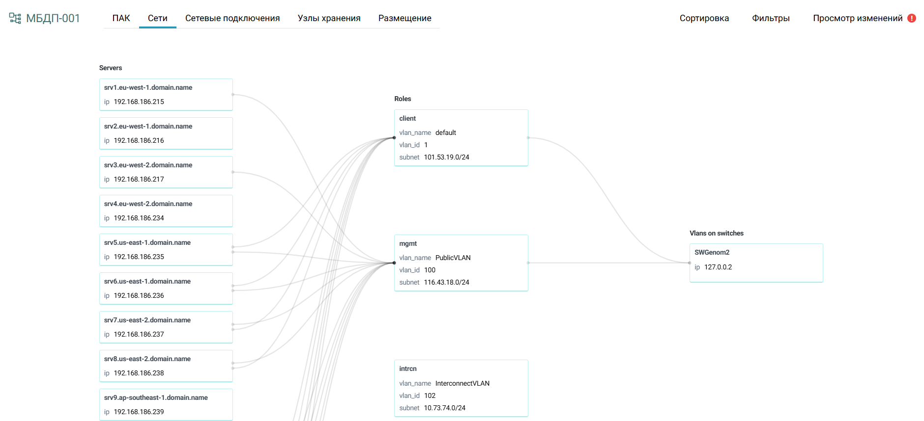 Экран отображает серверы ПАК, роли сетей и VLAN коммутаторов.