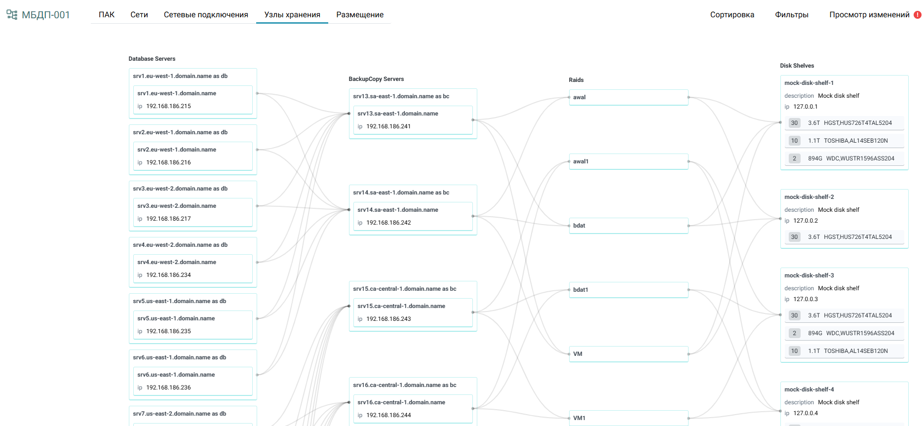 Экраны топологии отображают аппаратную инфраструктуру и сервисы ПАК в виде иерархической структуры объектов и связей между ними.