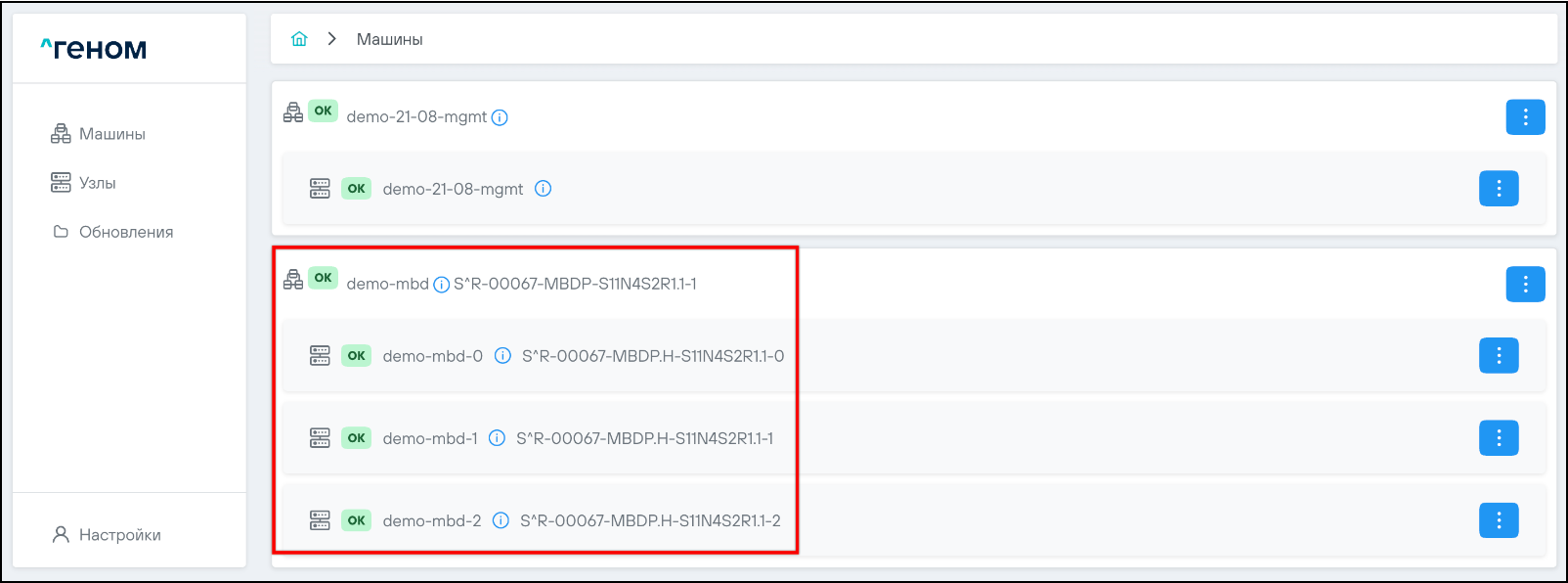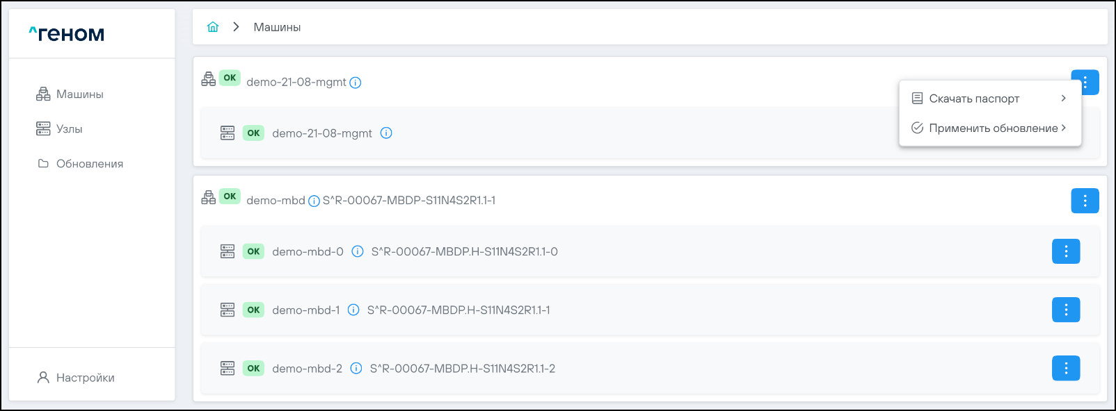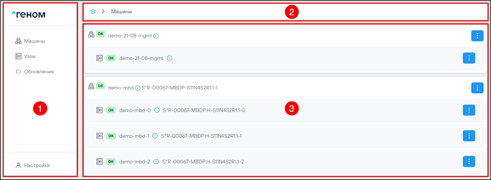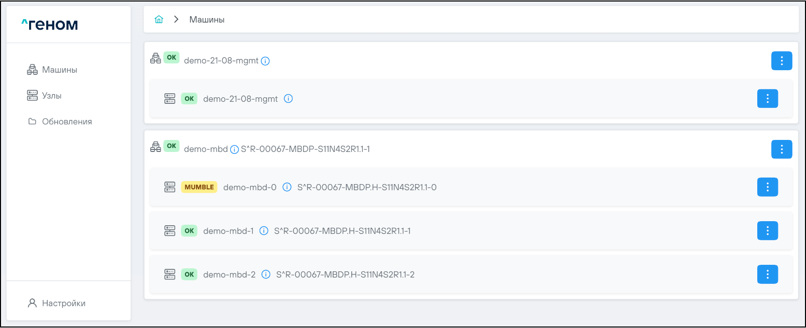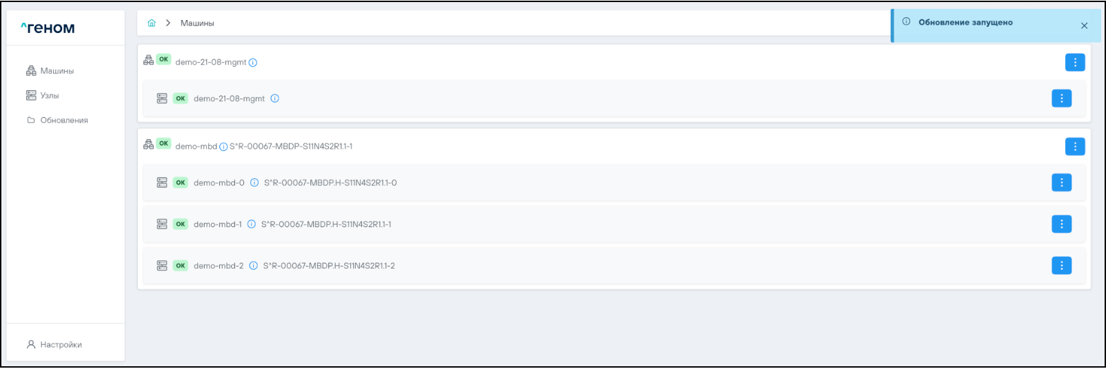 На странице отображается список Машин, которыми управляет экземпляр модуля управления ПО "Скала^р Геном". Для каждой Машины показан список входящих в неё узлов: