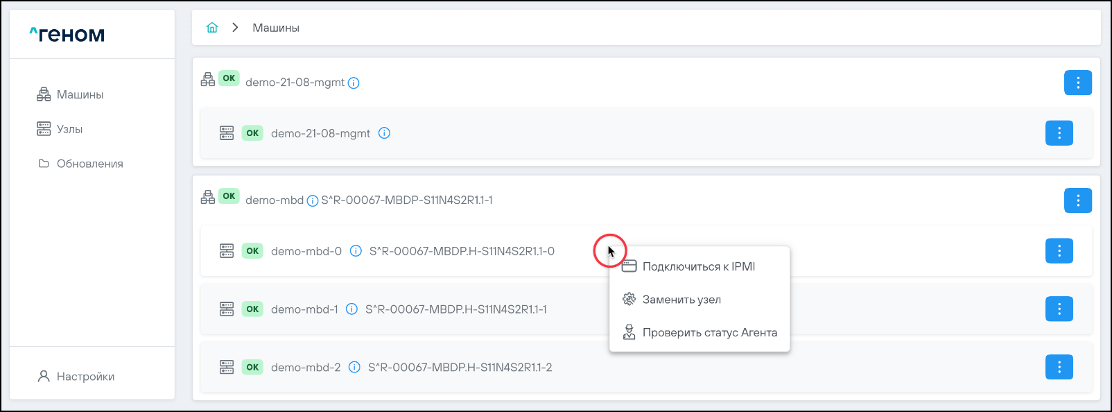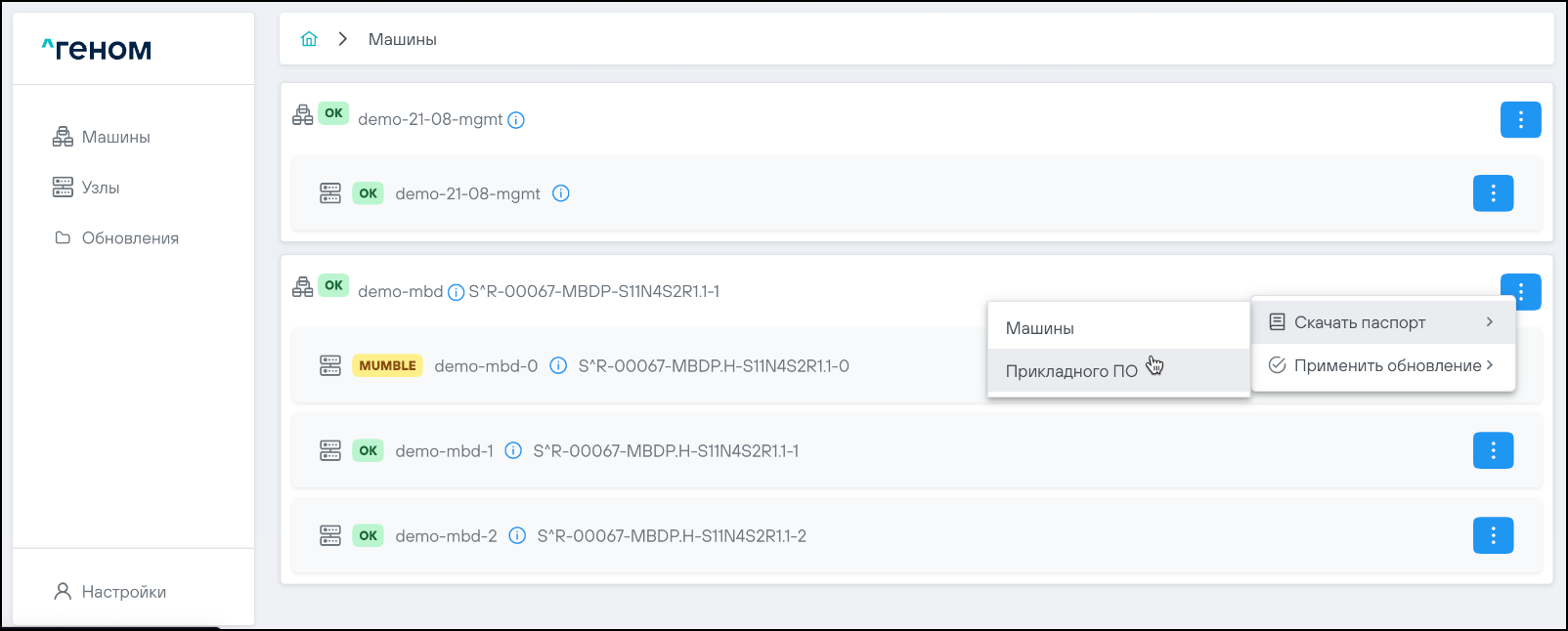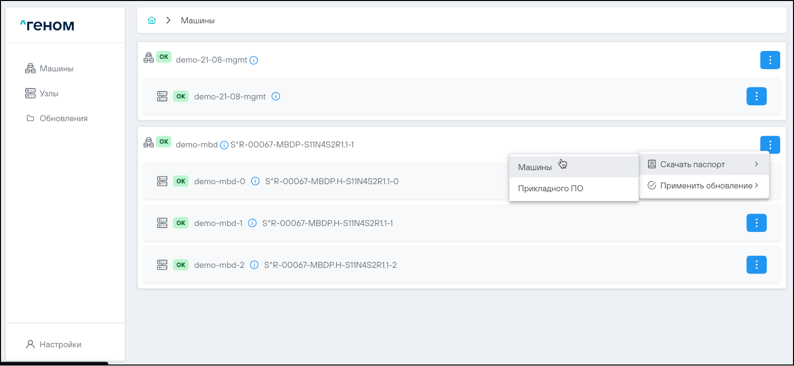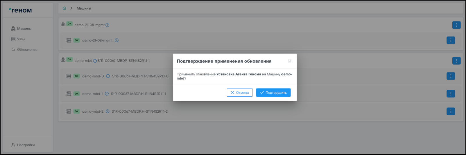 На странице отображается список Машин, которыми управляет экземпляр модуля управления ПО "Скала^р Геном". Для каждой Машины показан список входящих в неё узлов: