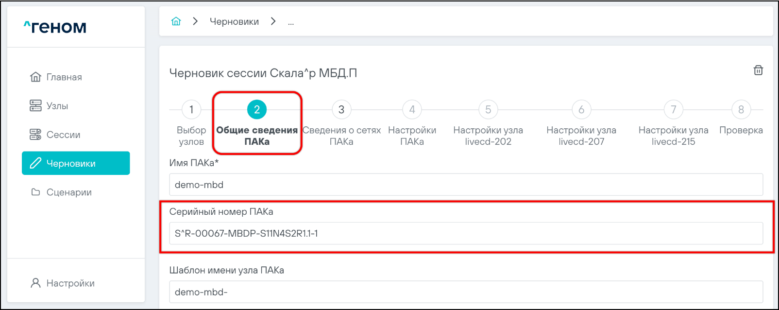 • Для Машины серийный номер задаётся на шаге "Общие сведения ПАКа":
