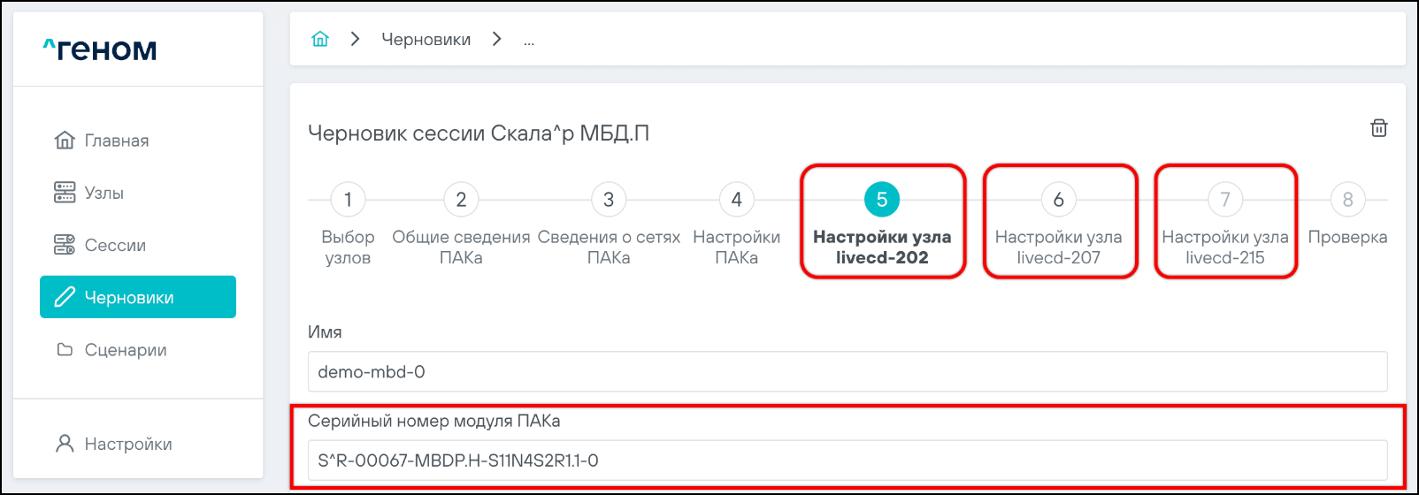 • Для узлов серийные номера вводятся в процессе выполнения шагов "Настройки узла":