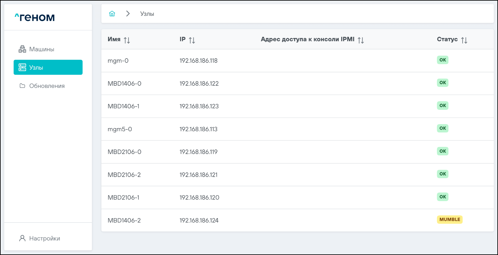 При выборе раздела  отображается список узлов всех Машин с IP-адресами, адресами доступа к консоли IPMI и текущими статусами: