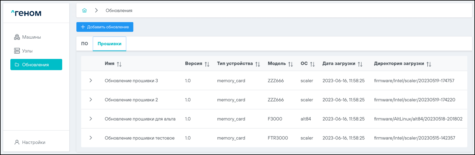 Для обновлений прошивок указаны имя, версия, размер, тип и модель устройства, ОС, а также дата и директория загрузки: