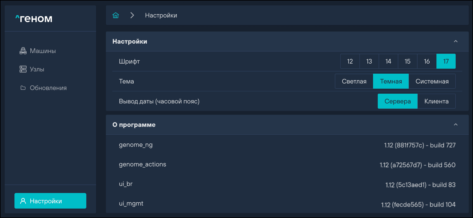 В блоке «О программе» отображаются версии компонентов ПО «Скала^р Геном».