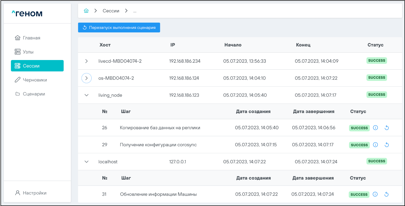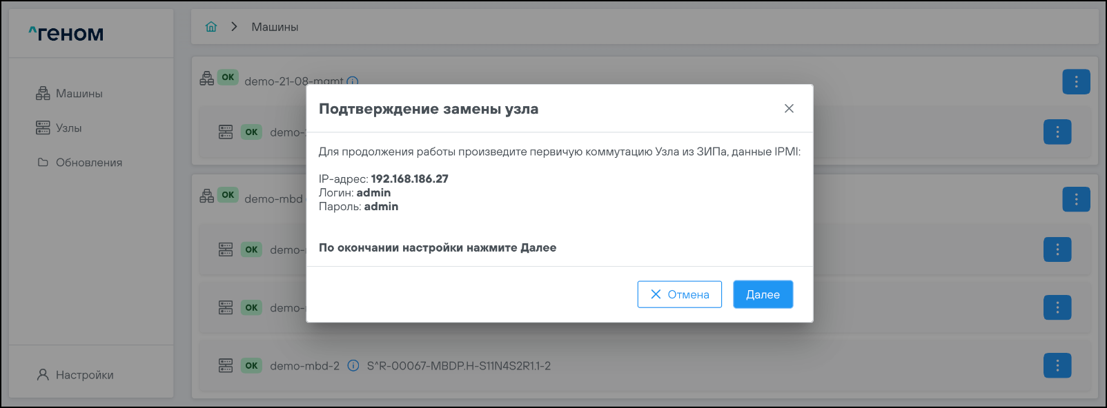 Порядок подключения к хостам по интерфейсу IPMI представлен в разделе ПОДКЛЮЧЕНИЕ К ХОСТАМ ПО ИНТЕРФЕЙСУ IPMI, порядок замены узла - в разделе ЗАМЕНА УЗЛА, порядок проверки статуса Агента Генома - в разделе Установка обновлений настоящего Руководства.