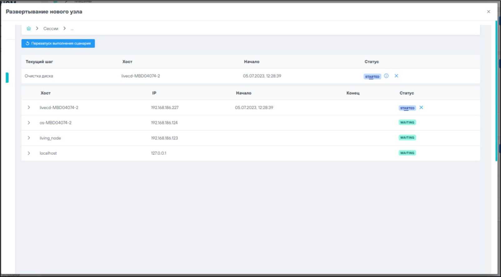 3. После загрузки узла диалоговое окно "Развертывание нового узла" сменяется на сценарий "Скала^р МБД - замена Узла":
