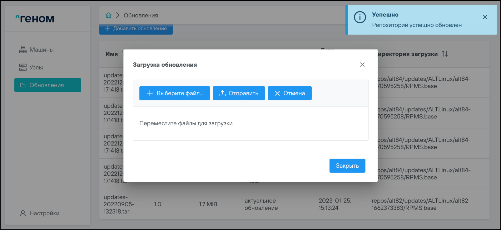 • Если проверка и загрузка файлов прошли успешно, появится всплывающее сообщение об успешном обновлении репозитория: