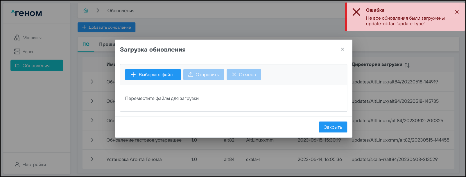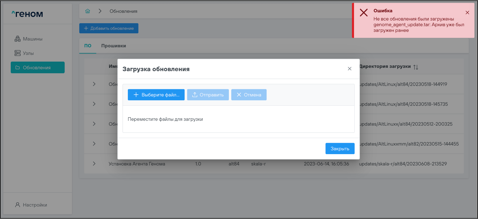 Для загрузки Агента в окне «Загрузка обновления» нужно выбрать и загрузить соответствующий файл:
