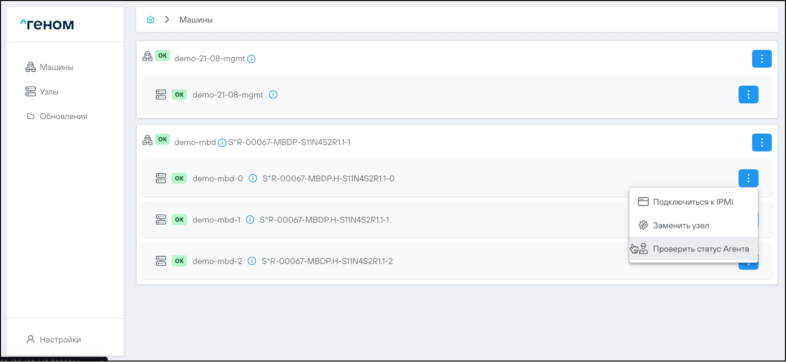 1. Проверить статус установленного агента на одном из узлов соответствующей Машины. Для этого нажать на кнопку для выбранного узла и выбрать пункт "Проверить статус Агента":