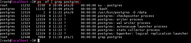 $ ps -ef | grep postgresЕсли отображается следующая информация, процессы PostgreSQL запущены.
