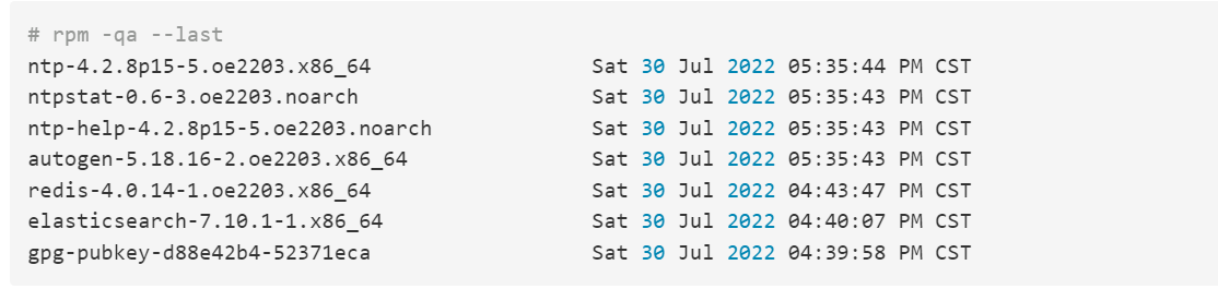 Linux — это многопользовательская ОС. Во время работы с Linux другие пользователи могли установить некоторые программные пакеты. Чтобы запросить недавно установленные пакеты в системе, используйте параметры -qa –last в команде rpm.