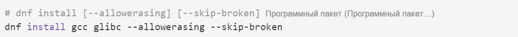 Во время установки программного пакета могут присутствовать конфликтующие пакеты или пакеты, которые невозможно установить. Вы можете добавить к команде параметр –allowerasing, чтобы заменить конфликтующие пакеты, или параметр –skip-broken, чтобы пропустить пакеты, которые невозможно установить.