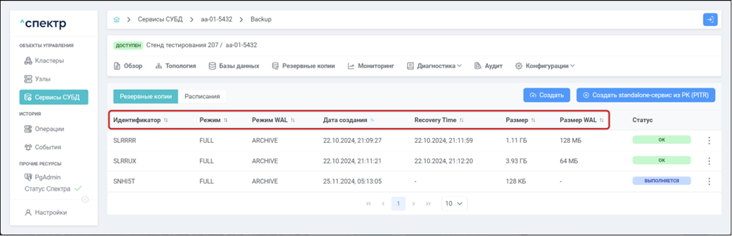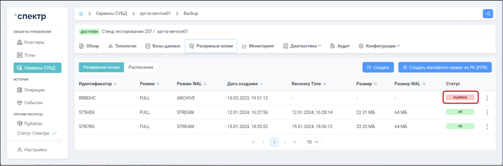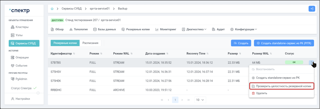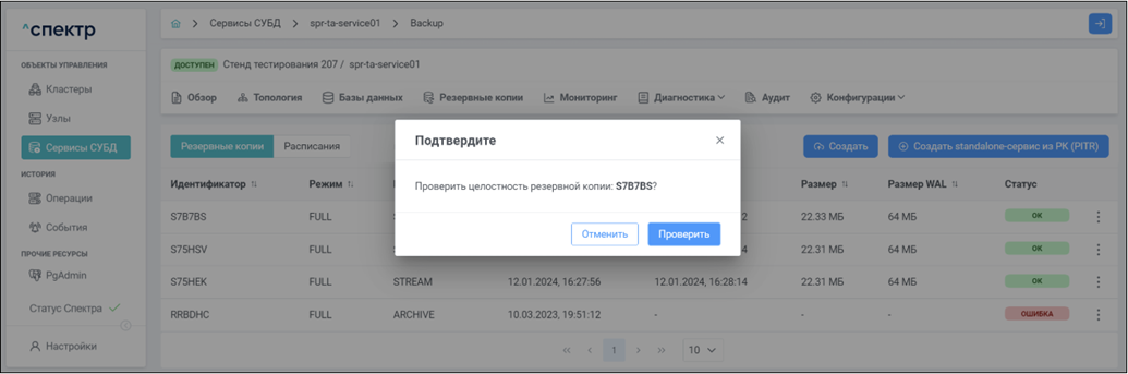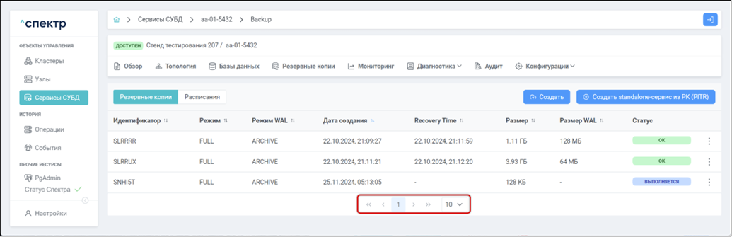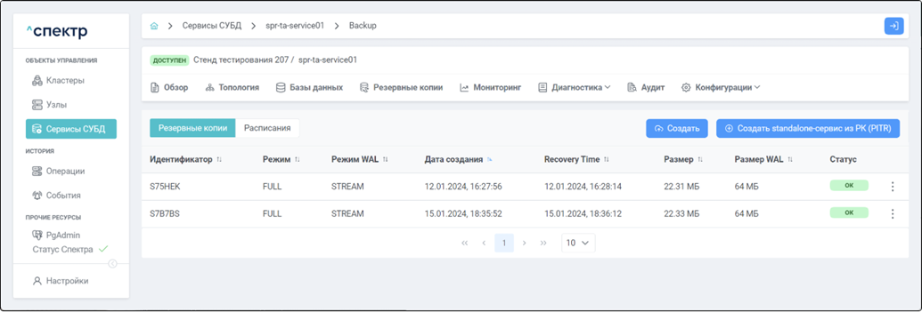• при переходе к пункту “Конфигурация pg_probackup” вкладки “Конфигурации” параметры конфигурации pg_probackup соответствуют заданным на шаге 4.
