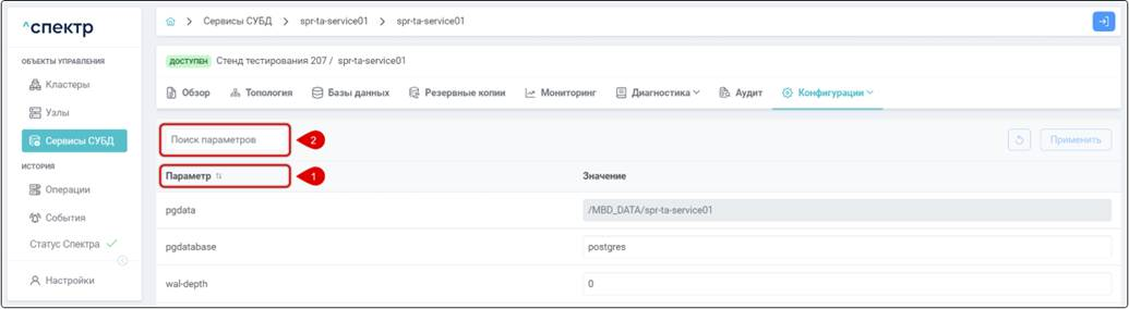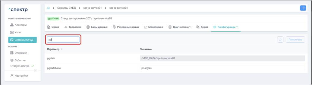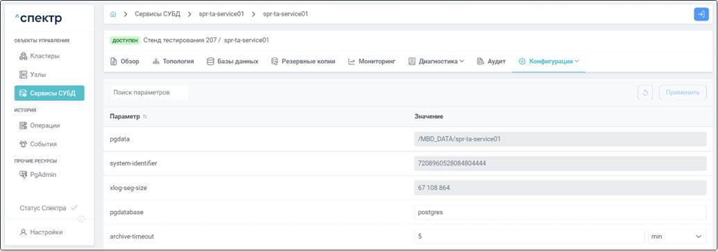 Не отображаются текущие действующие значения конфигурации Postgres при редактировании не через ПО “Скала^р Спектр”. Если изменения в конфигурацию Postgres вносятся напрямую через файлы конфигурации или с использованием SQL-оператора ALTER SYSTEM, и при этом конфигурация не перезагружается, то в веб-интерфейсе ПО “Скала^р Спектр” можно увидеть только новое значение параметра, которое еще не действует, а текущее действующее значение параметра увидеть нельзя. Выполнять перезагрузку конфигурации сервиса при редактировании параметров через файлы или редактировать параметры через ПО “Скала^р Спектр”.