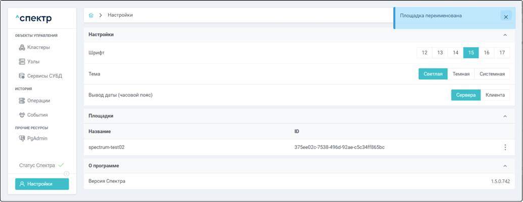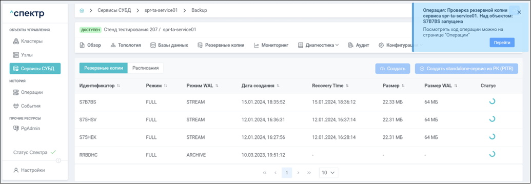 • Если ошибок валидации данных нет, в правом верхнем углу страницы отобразится всплывающее сообщение о запуске операции изменения параметров pg_probackup: