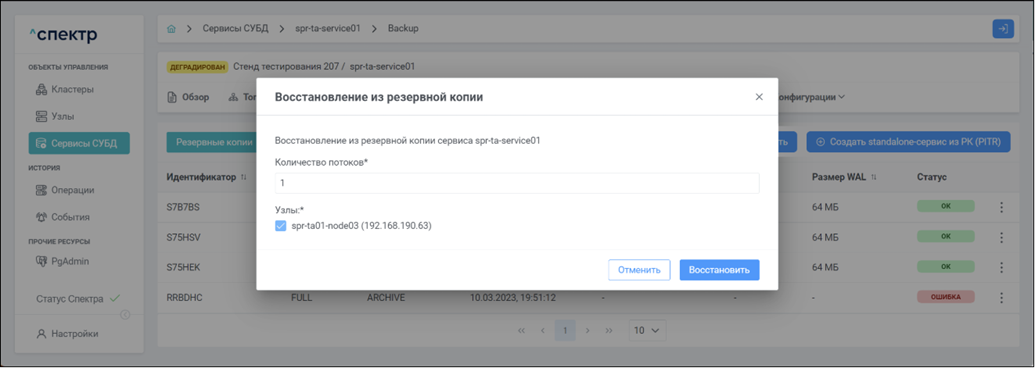 Узел хранения Узел, входящий в состав ПАК МБД.П, на котором хранятся резервные копии и архив WAL сервисов СУБД.
