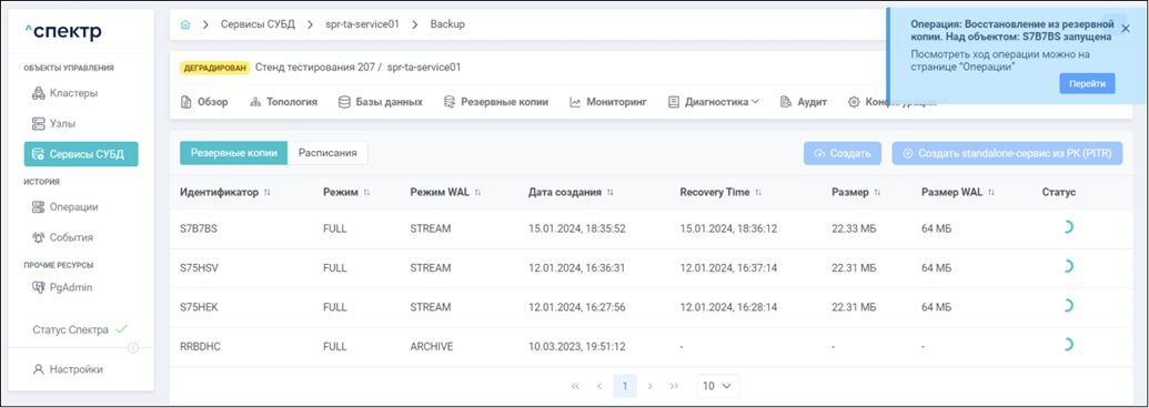 По нажатию кнопки “Перейти” во всплывающем сообщении будет осуществлен переход на страницу “Операции”. В верхней строке таблицы операций отобразится операция изменения параметров pg_probackup и статус её выполнения.