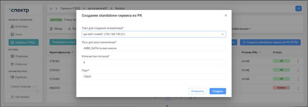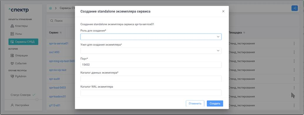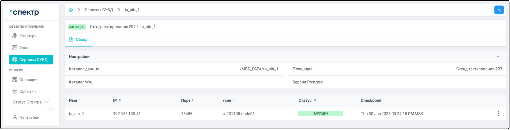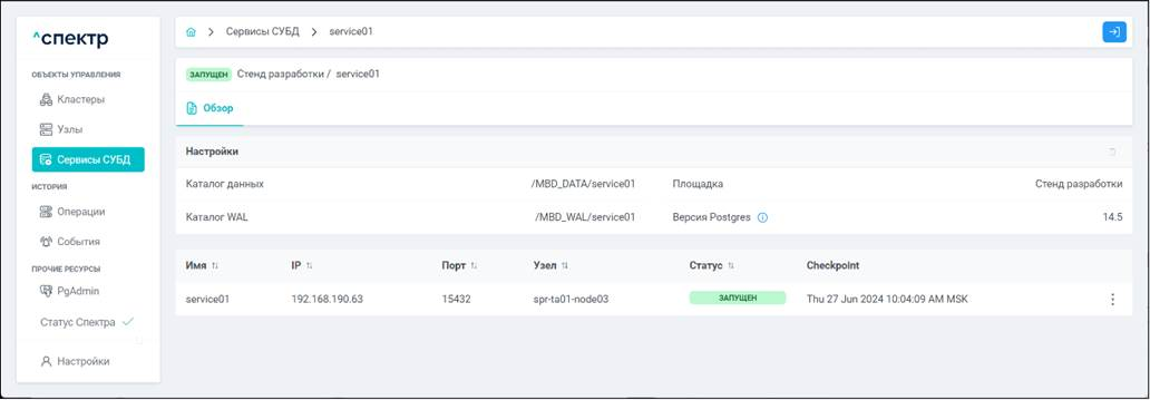 Экземпляр сервиса СУБД Работающий на конкретном узле набор процессов PostgreSQL определённой версии. Всегда принадлежит одному сервису СУБД. На узле могут работать несколько экземпляров СУБД, для этого могут использоваться техники изоляции между ними (например, контрольные группы).