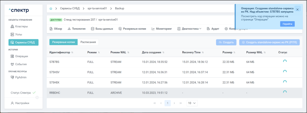 В правом верхнем углу страницы появится всплывающее сообщение о запуске операции изменения параметров pg_hba: