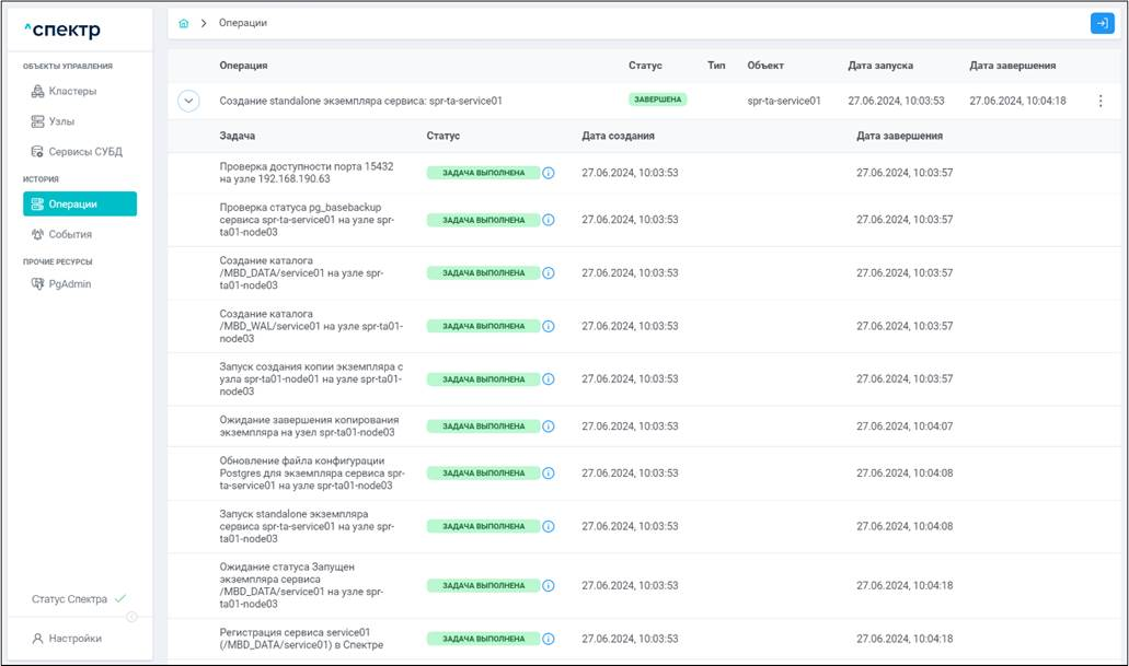 По нажатию кнопки “Перейти” во всплывающем сообщении будет осуществлен переход на страницу “Операции”. Операция изменения параметров pgconfig со статусом “НОВАЯ” и, далее, со статусом “ЗАВЕРШЕНА” появится в верхней строке.