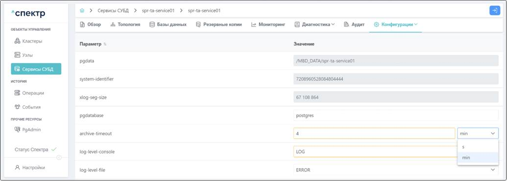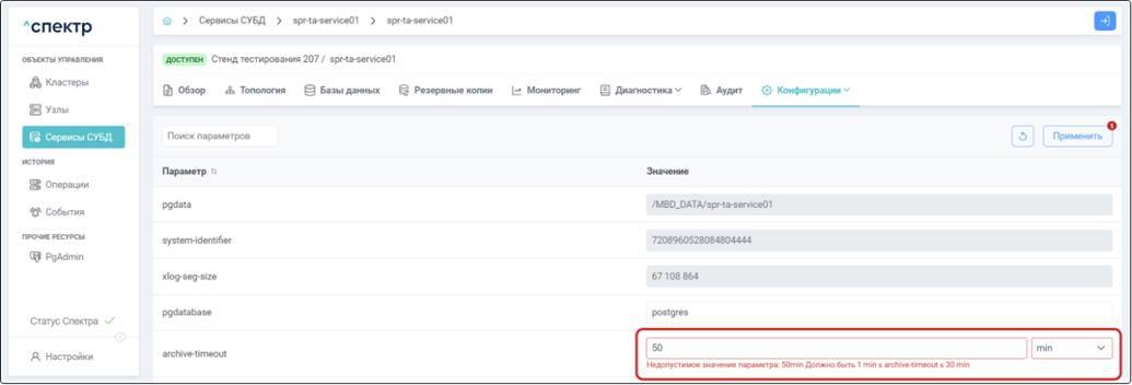 Возможно ввести любое значение для параметров конфигурации Postgres, для которых указана единица измерения параметра. Ряд параметров конфигурации Postgres допускает различный формат единиц измерения. Например, для параметра autovacuum_naptime единица измерения “s” (секунды). При этом значение параметра может указываться как с использованием единиц измерения, так и без. Для autovacuum_naptime возможно указание одного и того же значения в виде: 60, 60s, 1m. Для таких параметров не осуществляется проверка ввода, и пользователь может ввести произвольное значение параметра, в том числе и ошибочное, например, “1abc”. Вводить корректные значения параметров.
