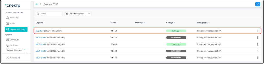 2. Нажать на имя сервиса для перехода на страницу со вкладками просмотра информации о выбранном сервисе и перейти на вкладку “Базы данных”.