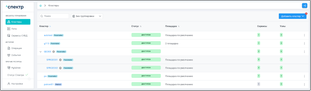 | Кластер | Объект управления верхнего уровня; группа узлов, на которой запускаются сервисы СУБД. Для обеспечения отказоустойчивости сервисов СУБД используется инструмент Pacemaker/Corosync. |