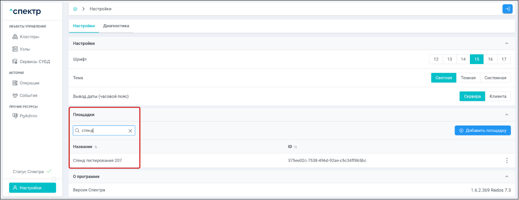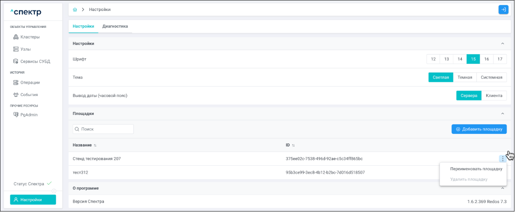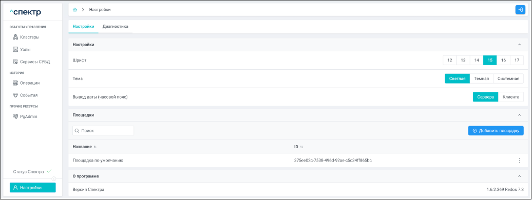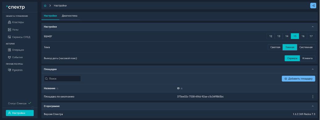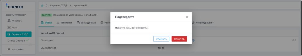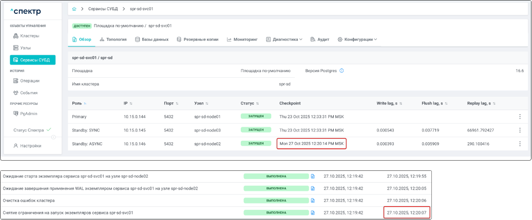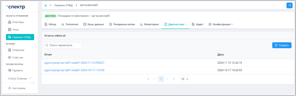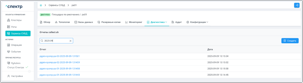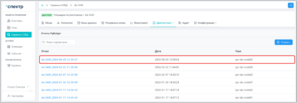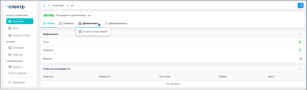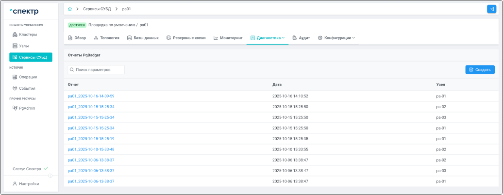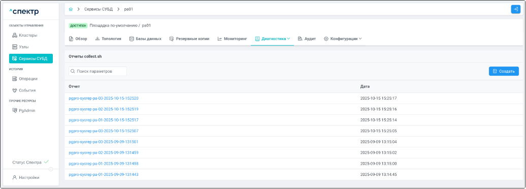 | Агент Спектра | Специализированное программное обеспечение, которое устанавливается на узлы кластера и используется в работе “Спектра” для выполнения следующих задач: получение актуальной конфигурации кластера; получение и обновление конфигураций СУБД и программы управляющей пулом соединений PgBouncer; выполнение операций с кластером, сервисами, узлами; предоставление метрик о состоянии кластера, узлов, сервисов СУБД, баз данных для системы мониторинга. |