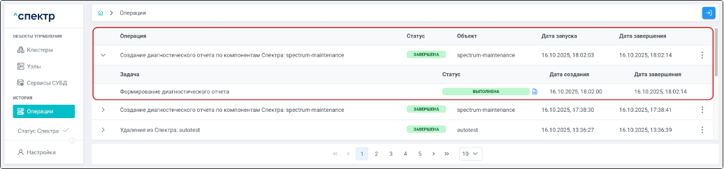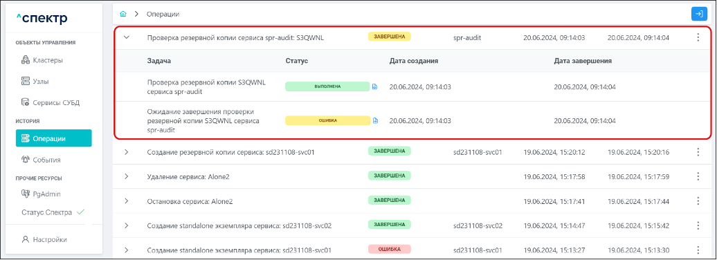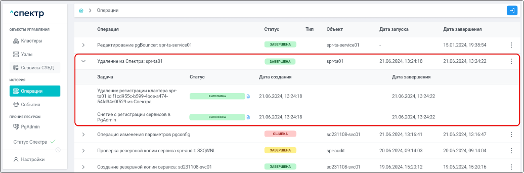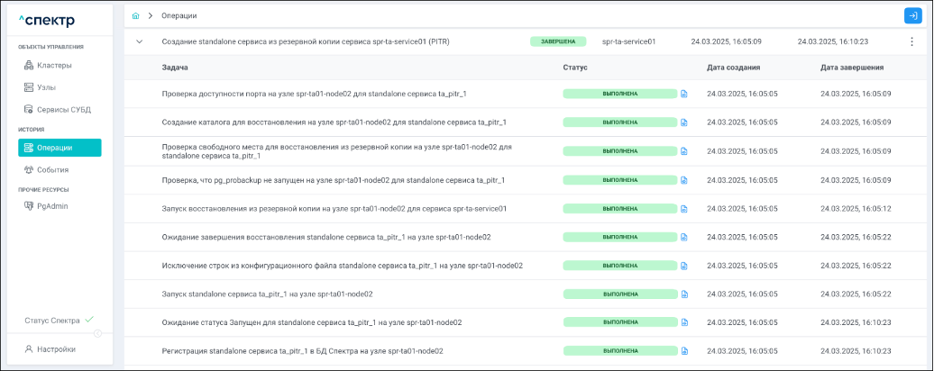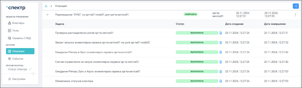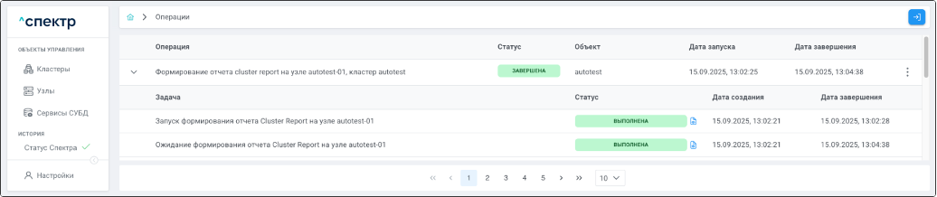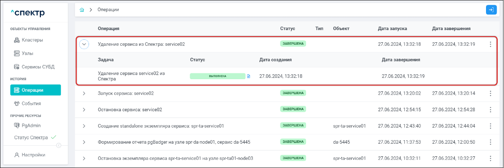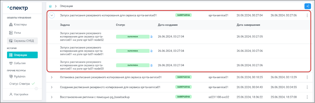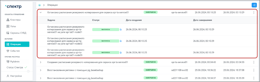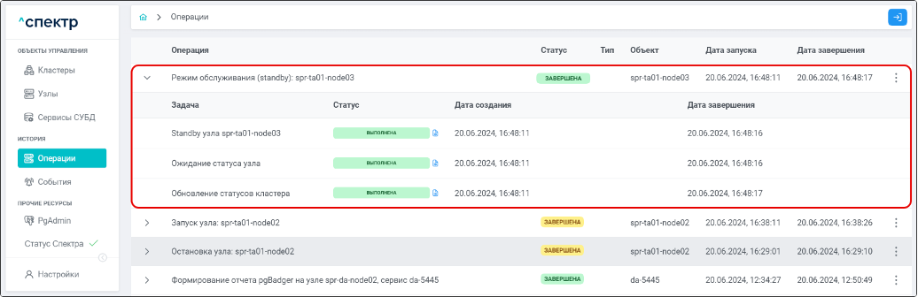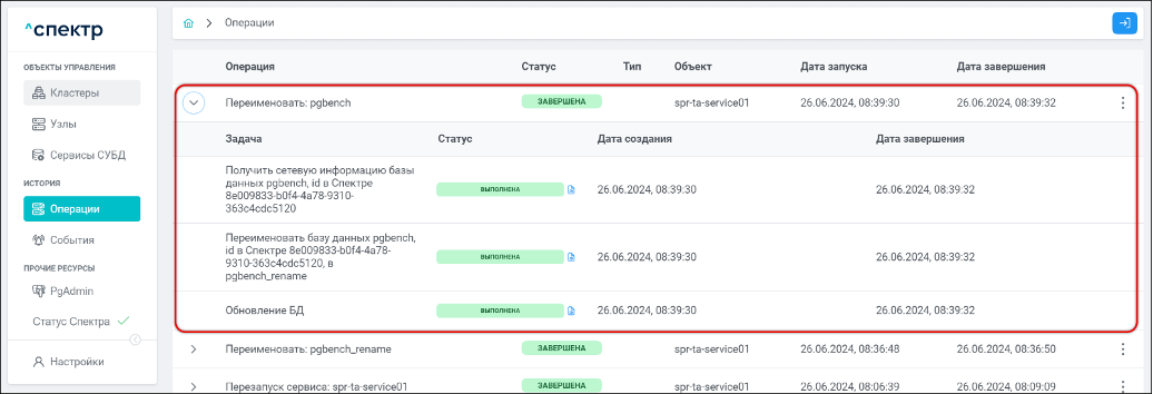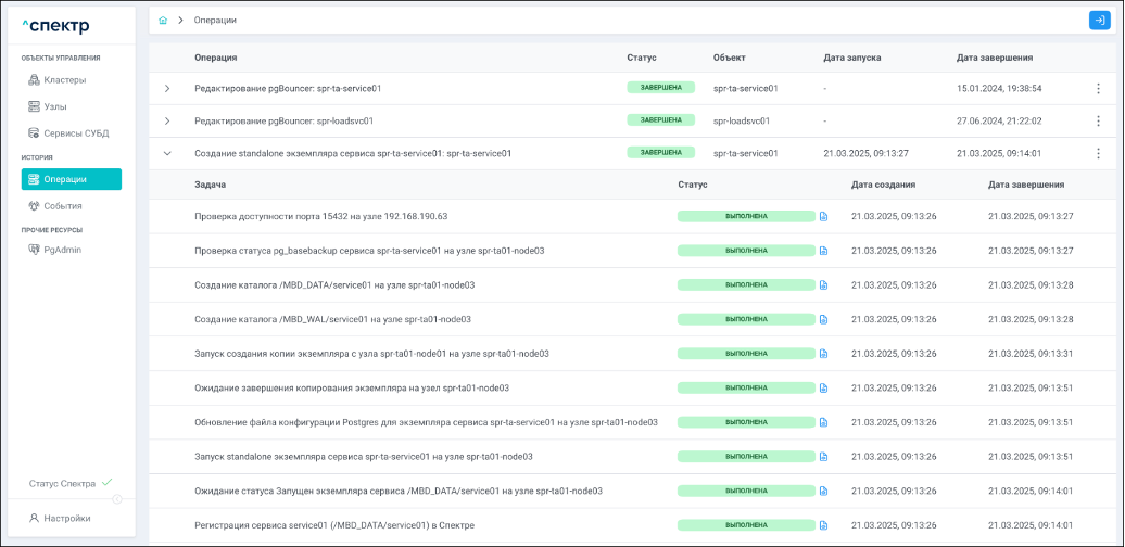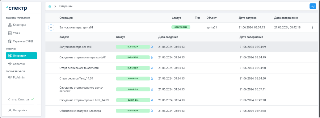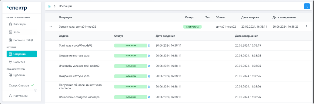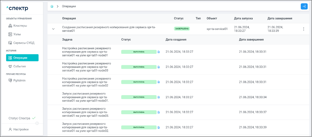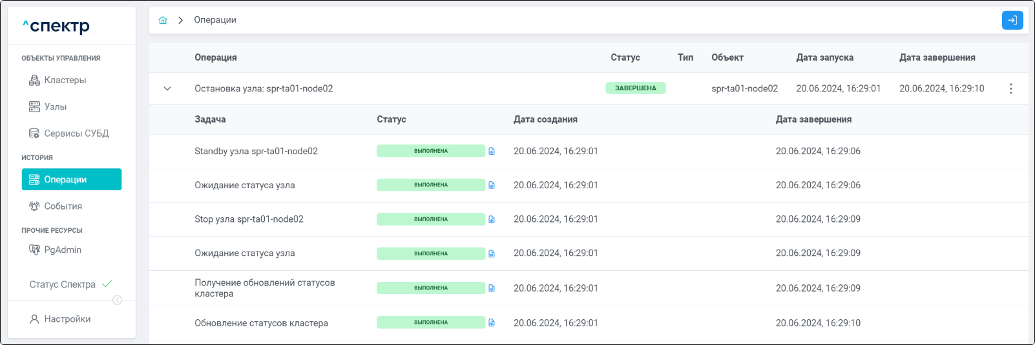 По нажатию кнопки “Перейти” во всплывающем сообщении будет осуществлен переход на страницу “Операции”. Операция изменения параметров pgconfig со статусом “НОВАЯ” и, далее, со статусом “ЗАВЕРШЕНА” появится в верхней строке.