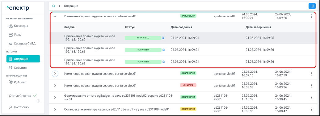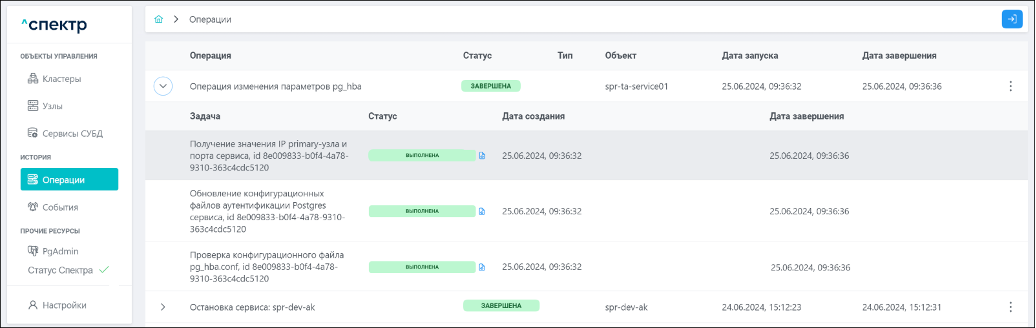 По нажатию кнопки “Перейти” во всплывающем сообщении будет осуществлен переход на страницу “Операции”. В верхней строке таблицы операций отображается операция изменения параметров pg_hba и статус её выполнения.