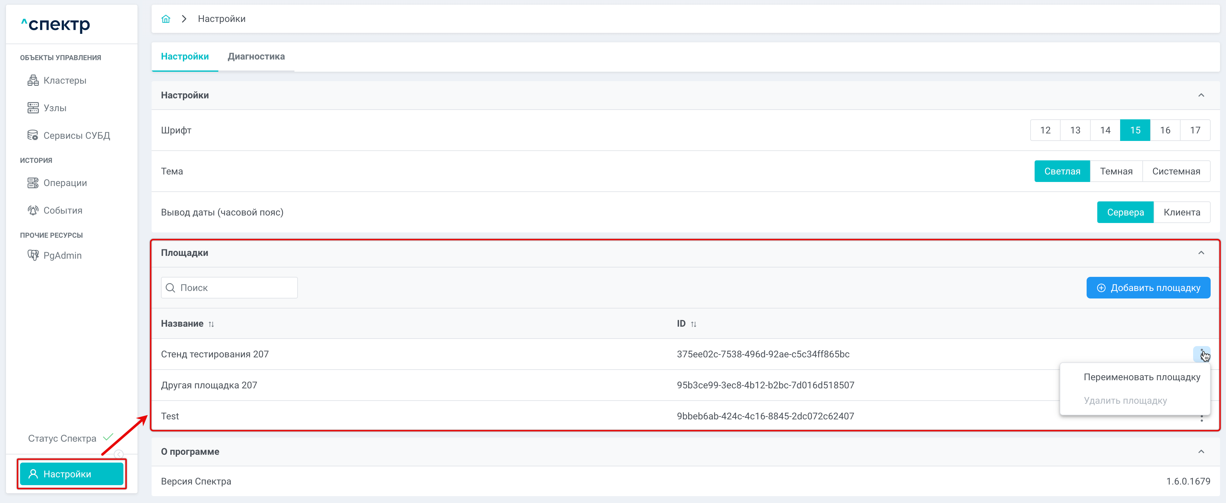 Добавлена возможность создания и удаления площадок: