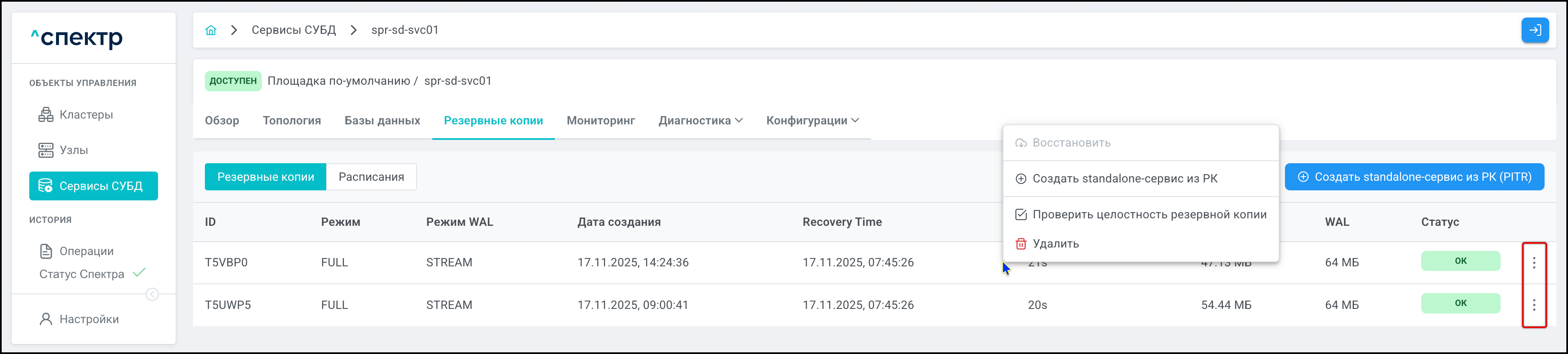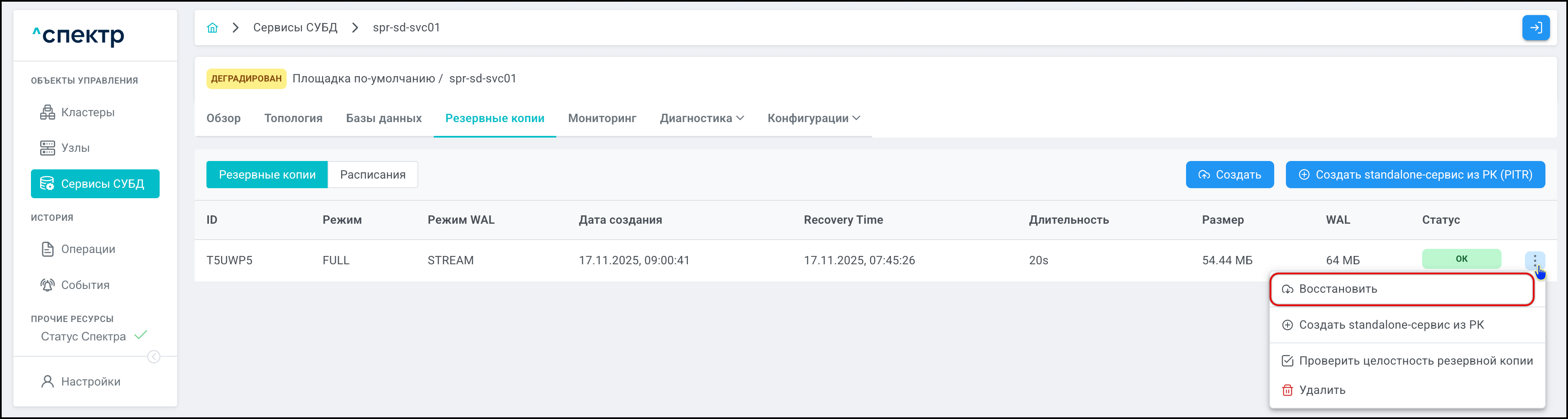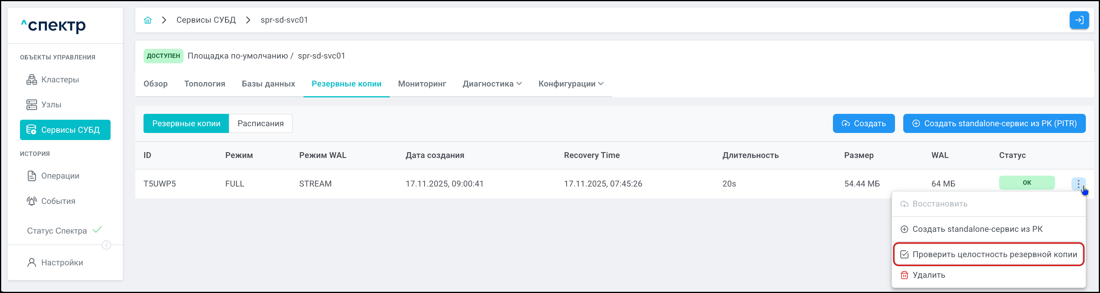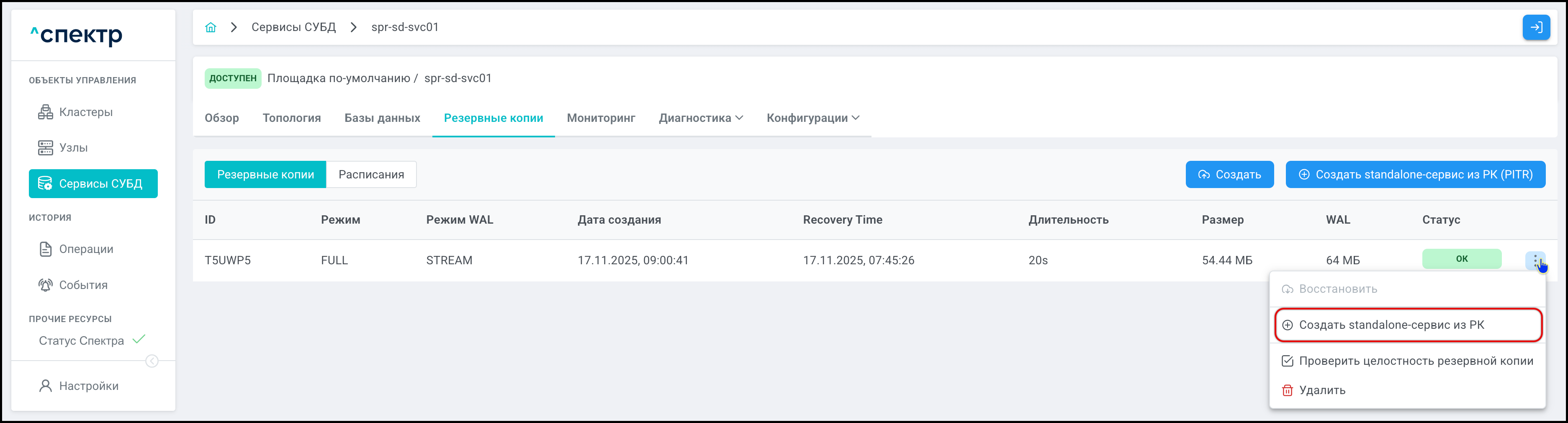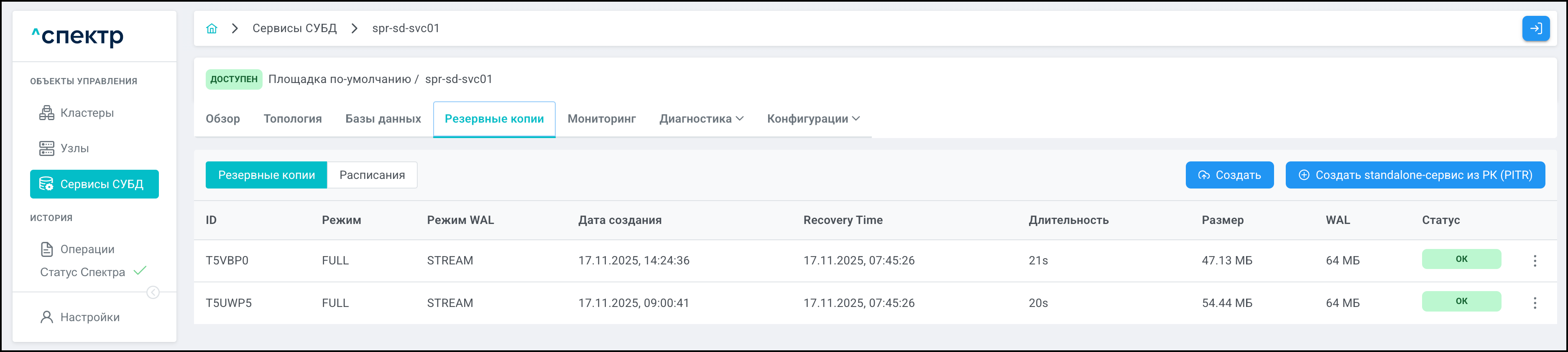 | Резервная копия | Бинарная копия файлов экземпляра СУБД (экземпляра сервиса), включающая в себя пользовательские данные, файлы конфигураций и журналы предзаписи. |