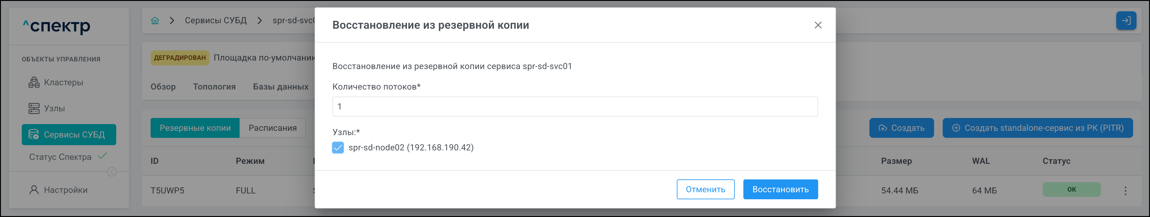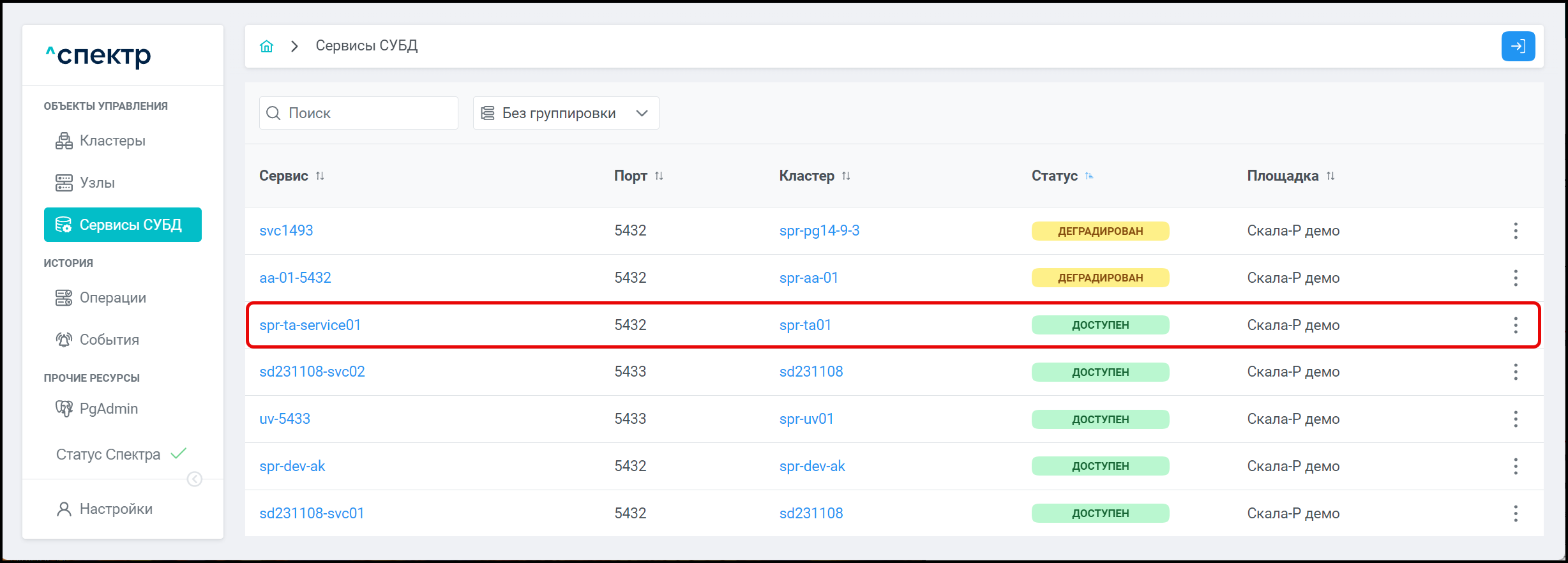 | Агент Спектра | Специализированное программное обеспечение, которое устанавливается на узлы кластера и используется в работе ПО «Скала^р Спектр» для выполнения следующих задач: получение актуальной конфигурации кластера; получение и обновление конфигураций СУБД и программы управляющей пулом соединений PgBouncer; выполнение операций с кластером, сервисами, узлами; предоставление метрик о состоянии кластера, узлов, сервисов СУБД, баз данных для системы мониторинга. |