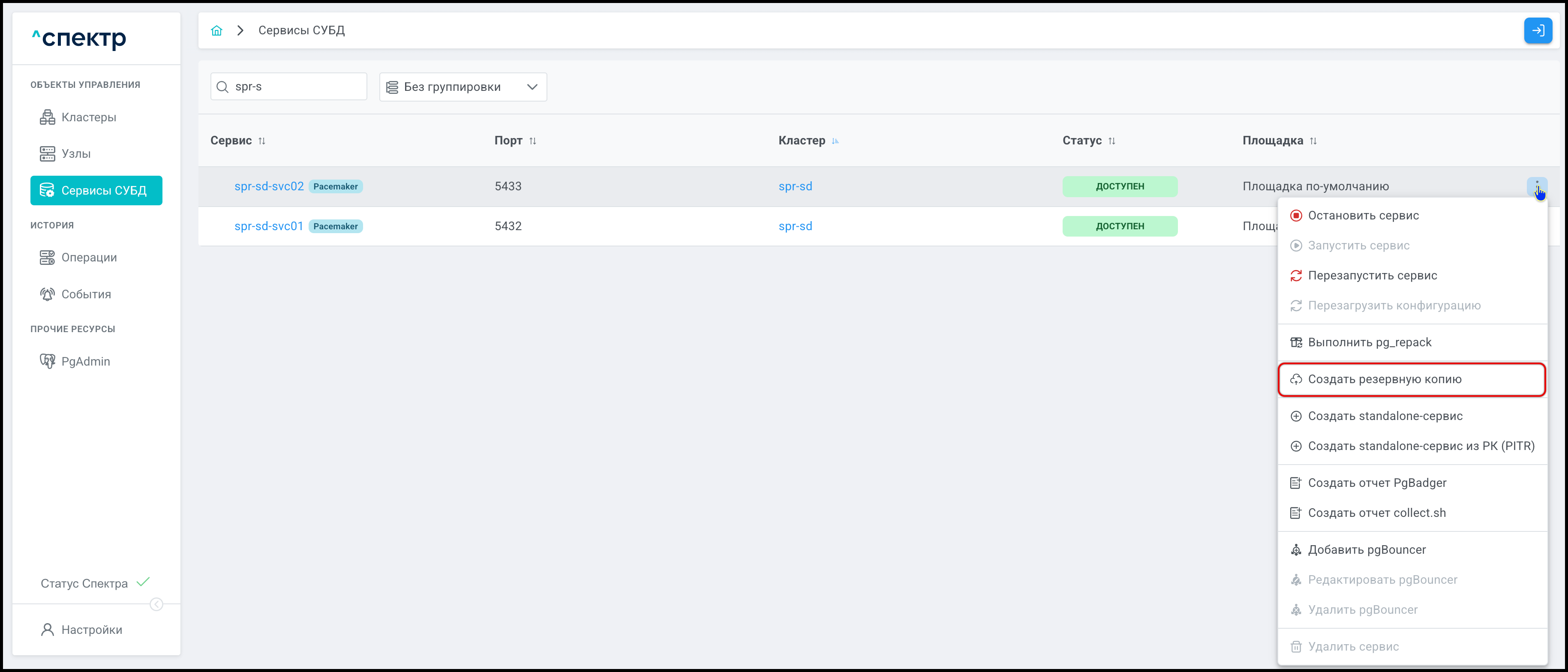 | Если при установке “Спектра” не был введен корректный IP-адрес, по которому доступно ПО “Скала^р Геном-Управление”, пункт меню “Добавить pgBouncer” для всех сервисов будет недоступен. |