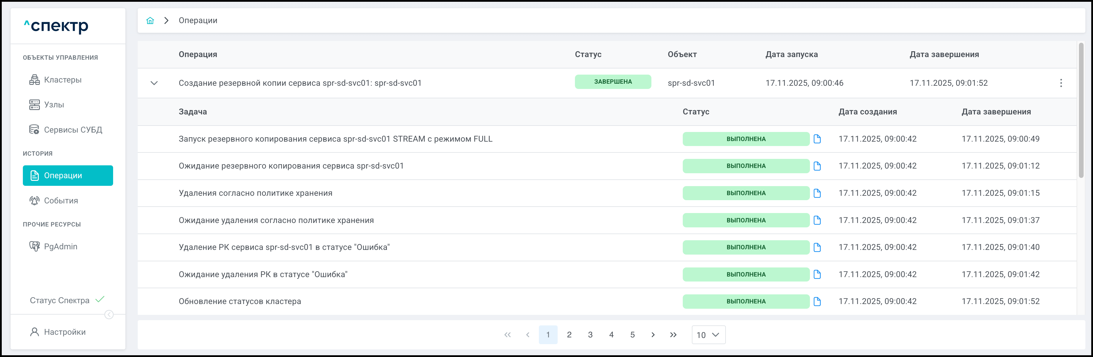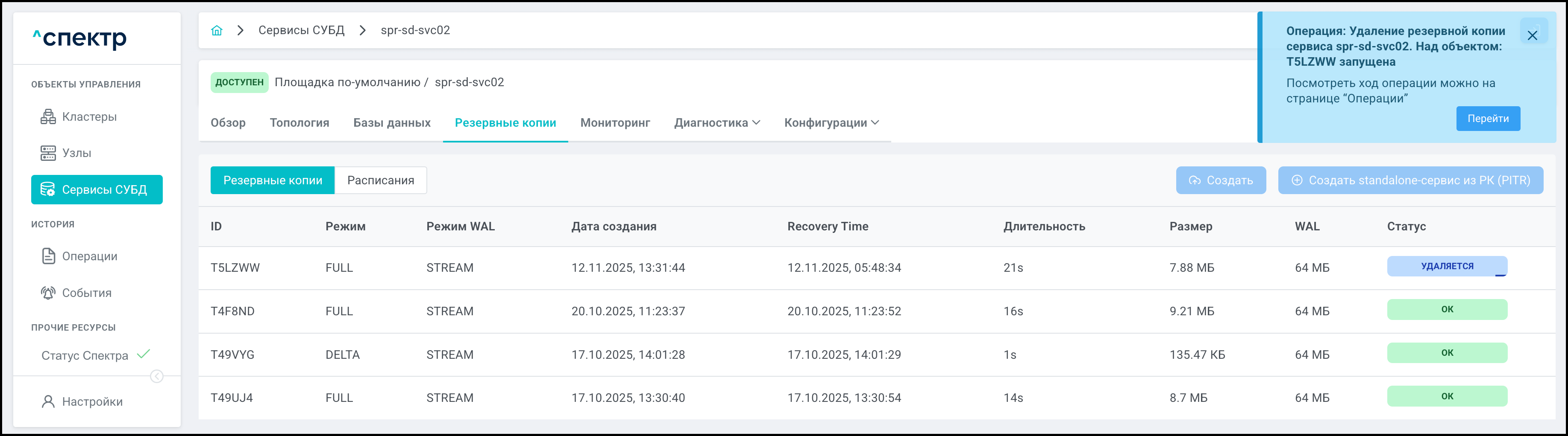 По нажатию кнопки “Перейти” во всплывающем сообщении будет осуществлен переход на страницу “Операции”. В верхней строке таблицы операций отображается операция удаления pgBouncer и статус её выполнения.