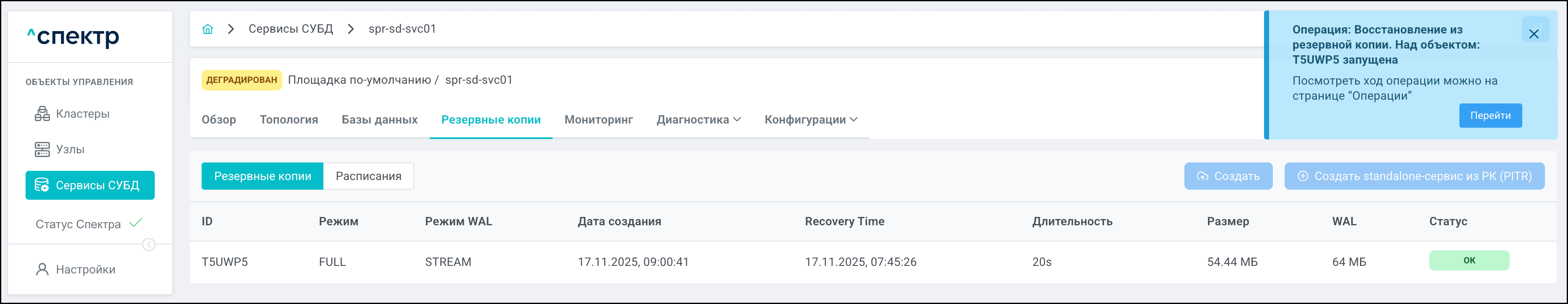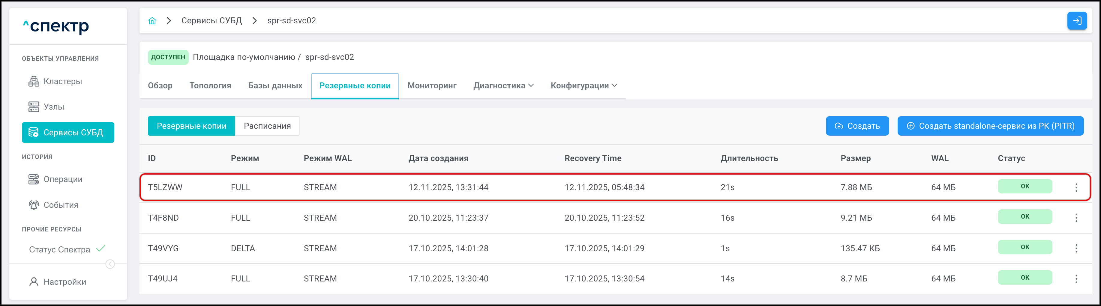 | PITR | Point-In-Time Recovery. Создание standalone-сервиса из резервной копии с указанием на конкретный момент времени, на который актуально восстанавливаемое состояние. |