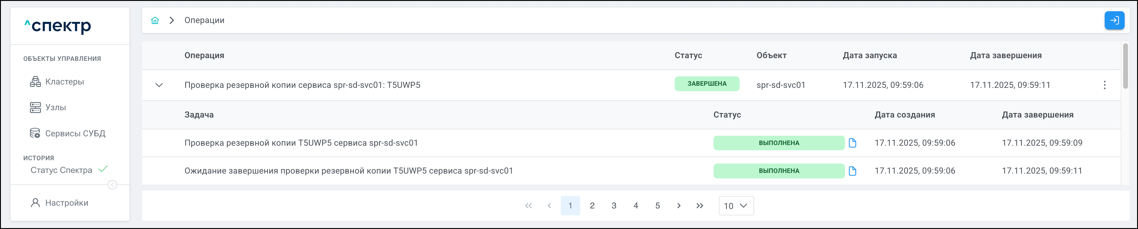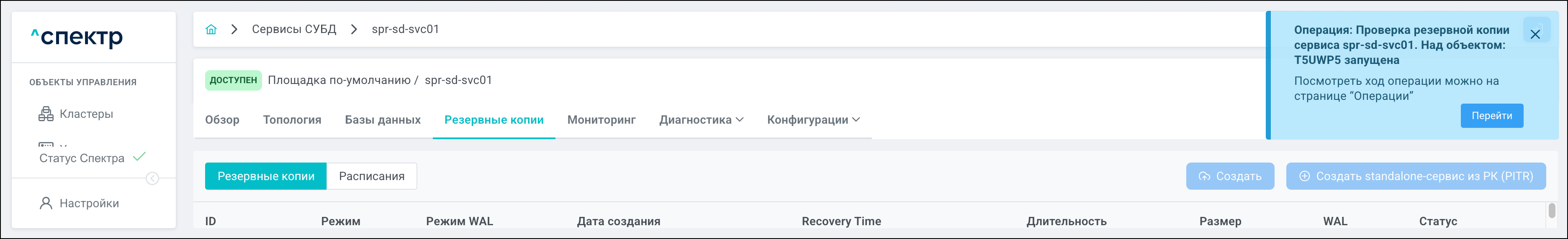 По нажатию кнопки “Перейти” во всплывающем сообщении будет осуществлен переход на страницу “Операции”. Операция переименования БД со статусом “НОВАЯ” и, далее, со статусом “ЗАВЕРШЕНА” появится в верхней строке.