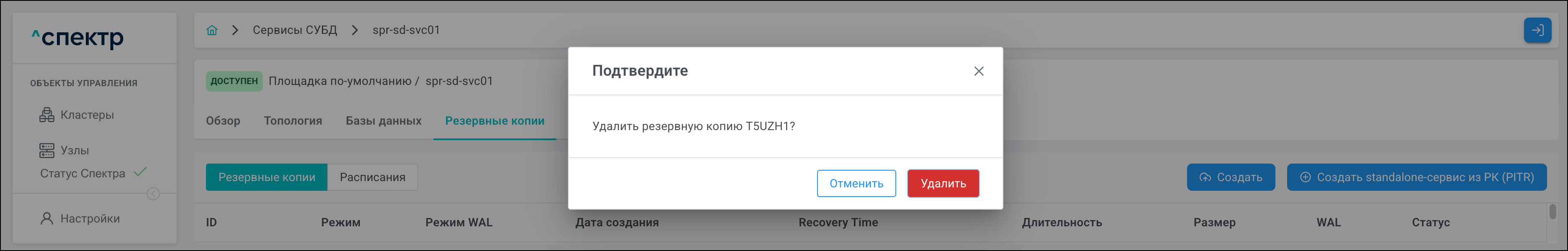 Для кластеров Patroni доступны операции импорта и удаления из Спектра.