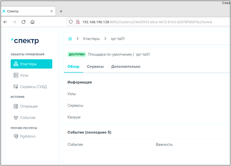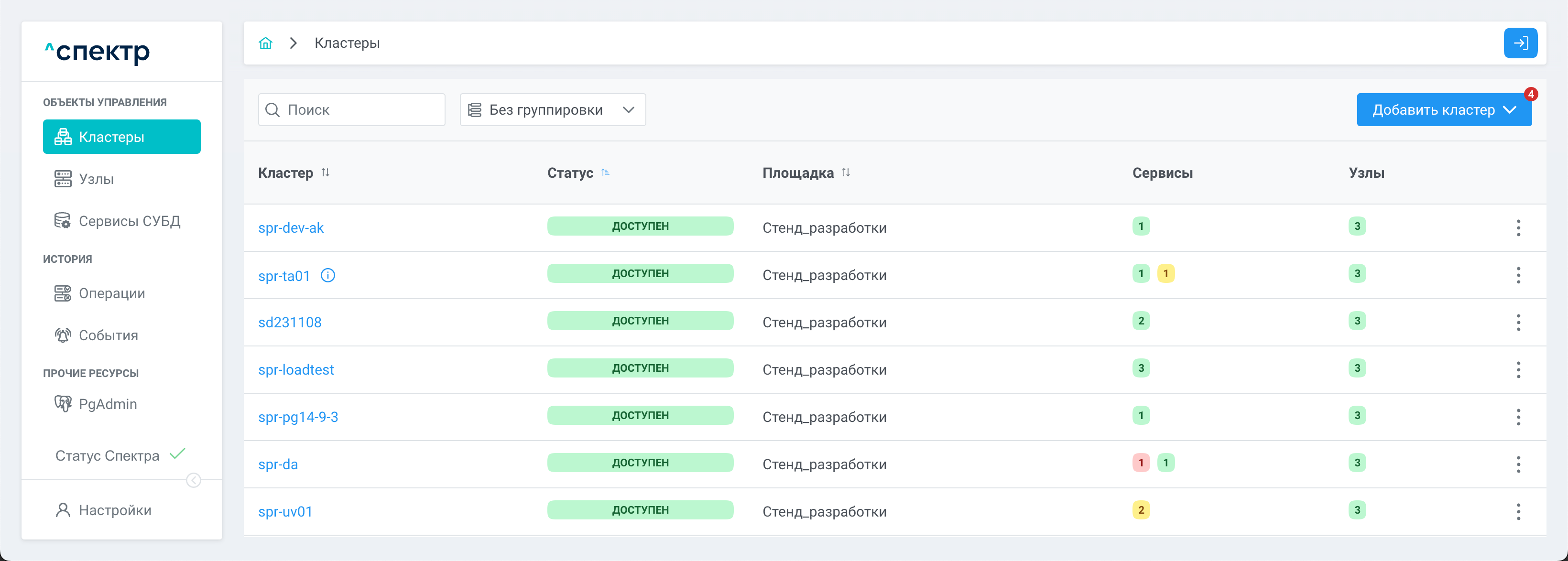 - Управление кластерами для выполнения операций «старт кластера», «остановка кластера», «импорт кластера», «удаление кластера из Спектра»;