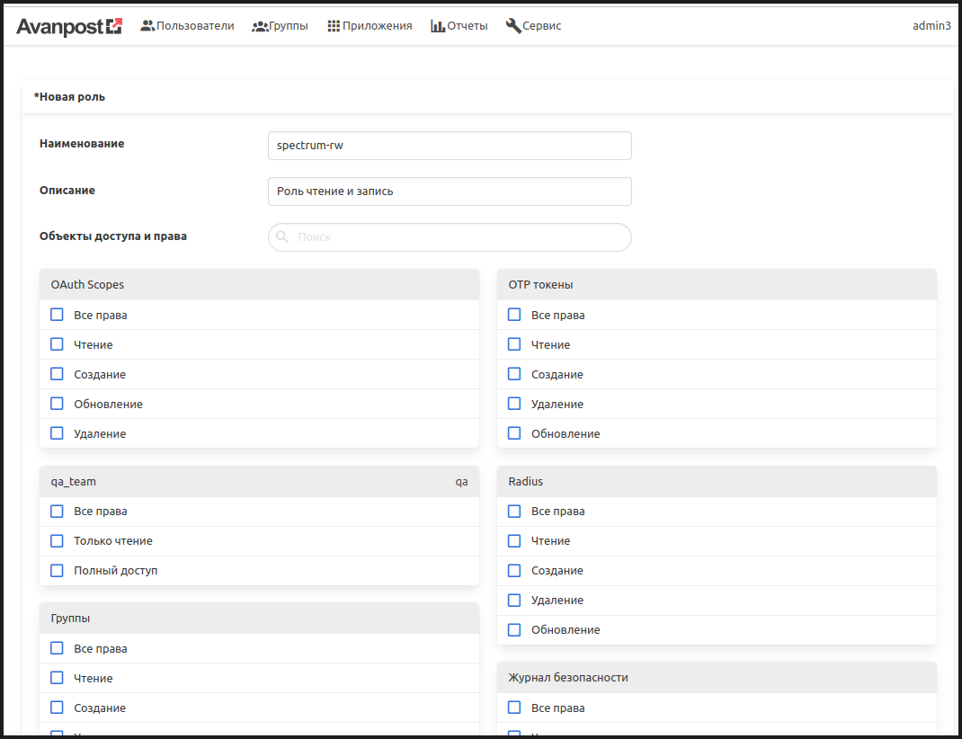 - Для создаваемой роли выбрать необходимые права: