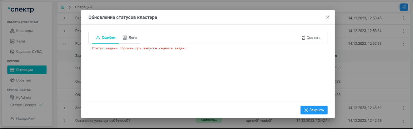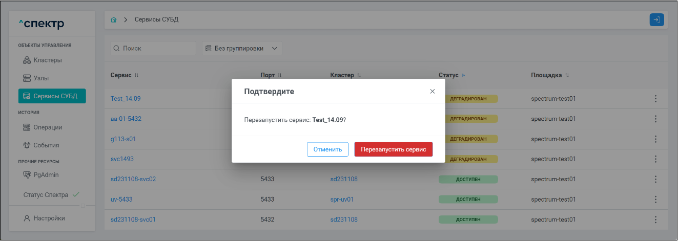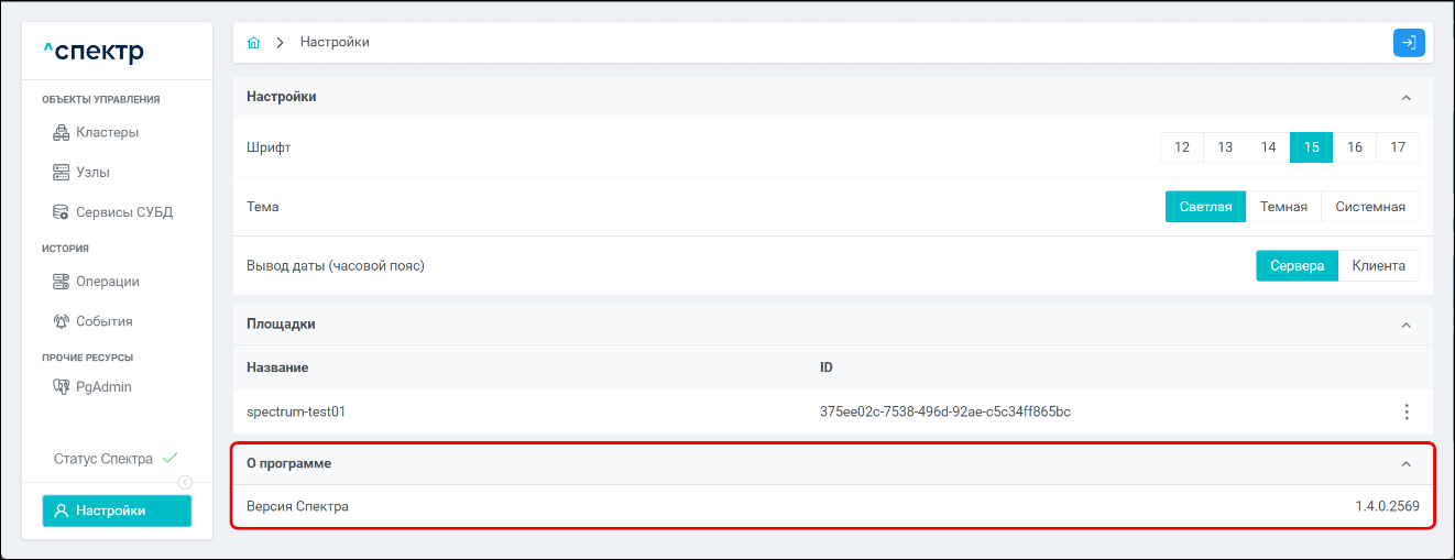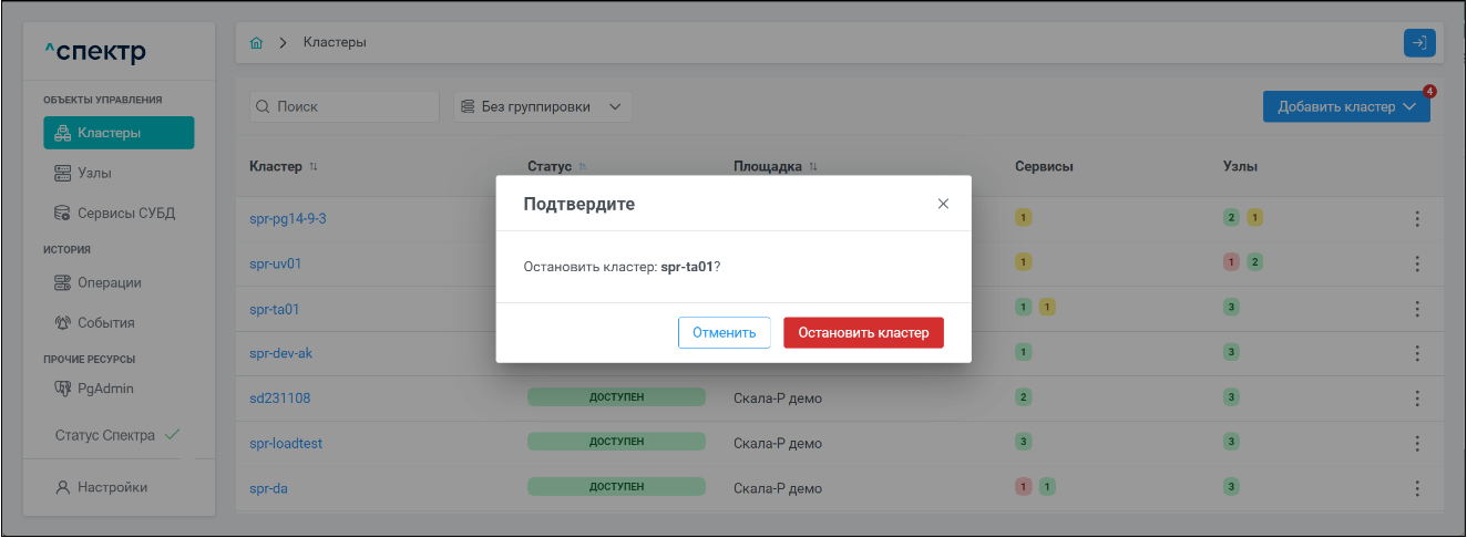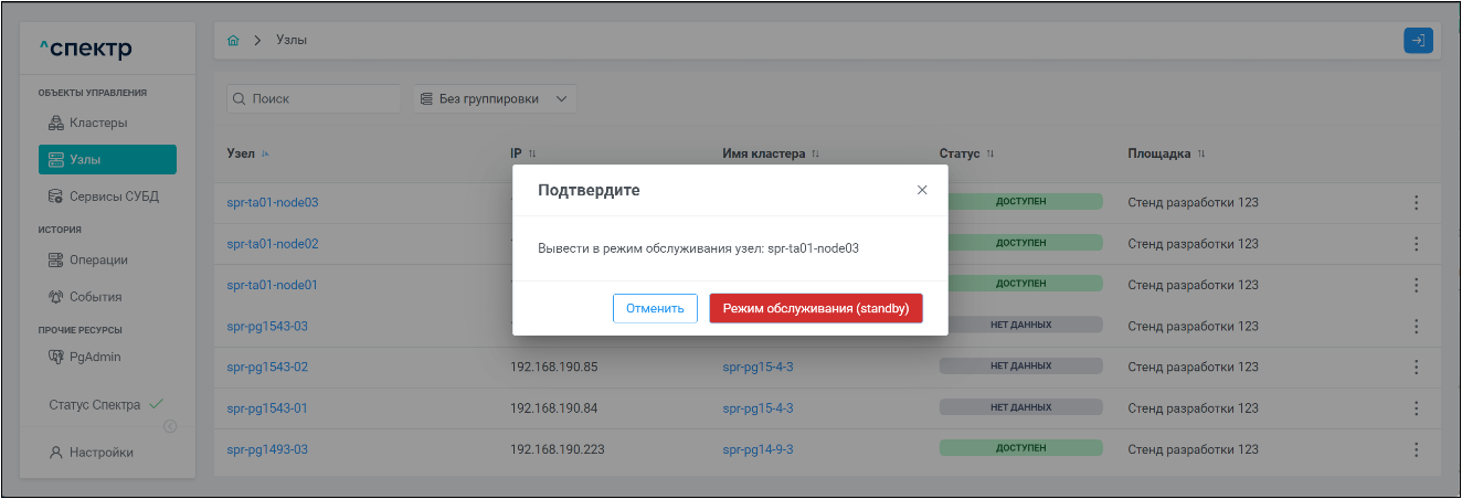 | Агент Спектра | Специализированное программное обеспечение, которое устанавливается на узлы кластера и используется в работе ПО «Скала^р Спектр» для выполнения следующих задач: получение актуальной конфигурации кластера; получение и обновление конфигураций СУБД и программы управляющей пулом соединений PgBouncer; выполнение операций с кластером, сервисами, узлами; предоставление метрик о состоянии кластера, узлов, сервисов СУБД, баз данных для системы мониторинга. |