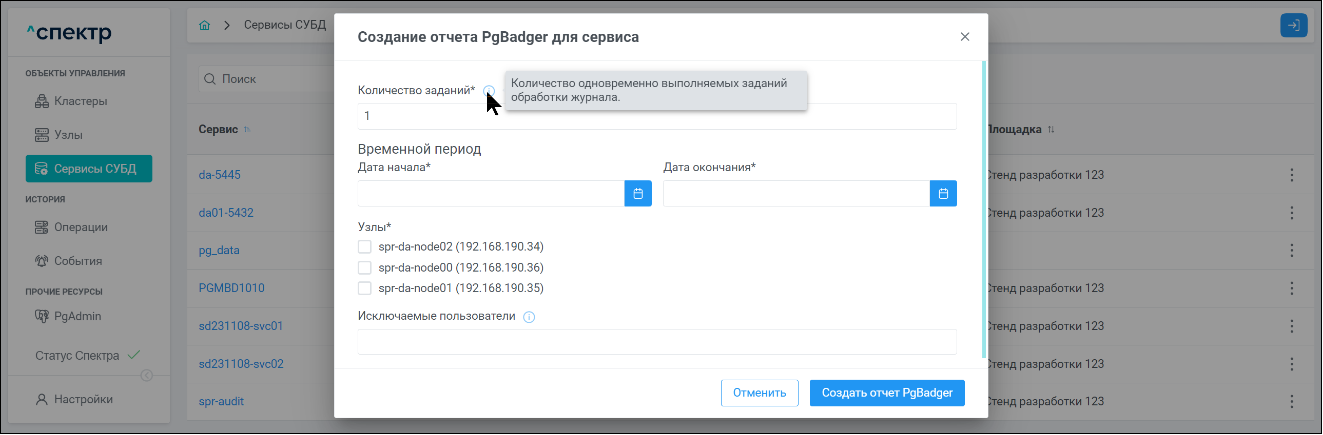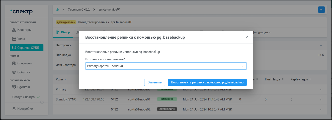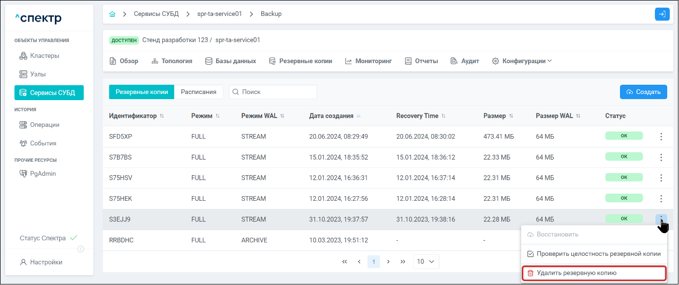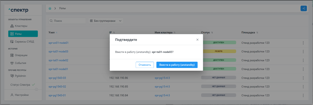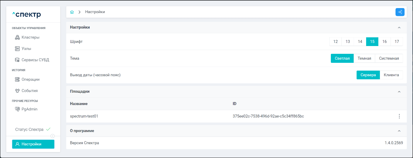 | Агент Спектра | Специализированное программное обеспечение, которое устанавливается на узлы кластера и используется в работе ПО «Скала^р Спектр» для выполнения следующих задач: получение актуальной конфигурации кластера; получение и обновление конфигураций СУБД и программы управляющей пулом соединений PgBouncer; выполнение операций с кластером, сервисами, узлами; предоставление метрик о состоянии кластера, узлов, сервисов СУБД, баз данных для системы мониторинга. |