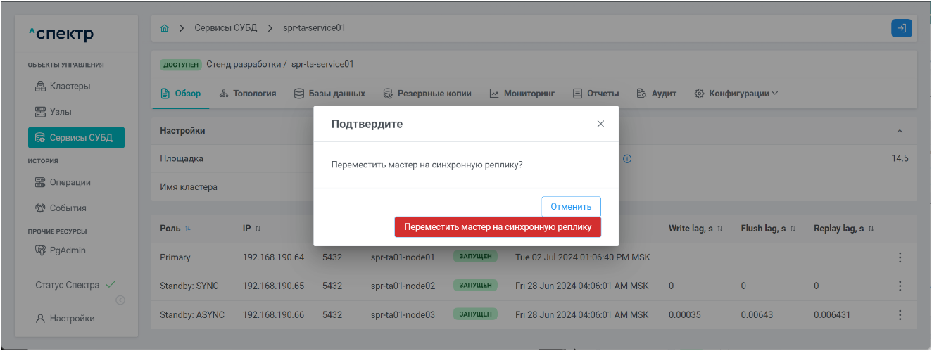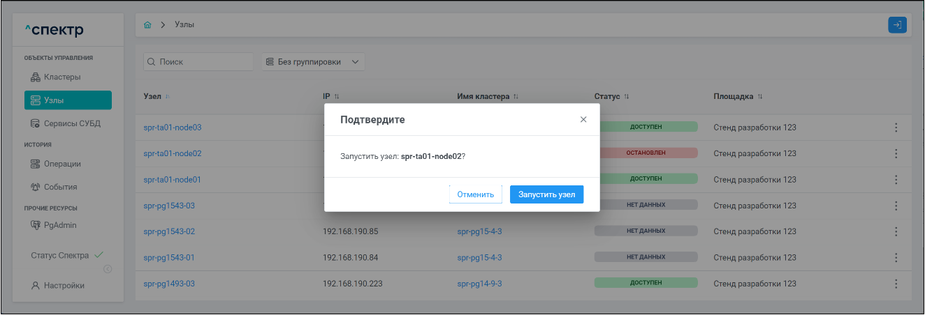 | Кластер | Объект управления верхнего уровня; группа узлов, на которой запускаются сервисы СУБД. Для обеспечения отказоустойчивости сервисов СУБД используется инструмент Pacemaker/Corosync. |